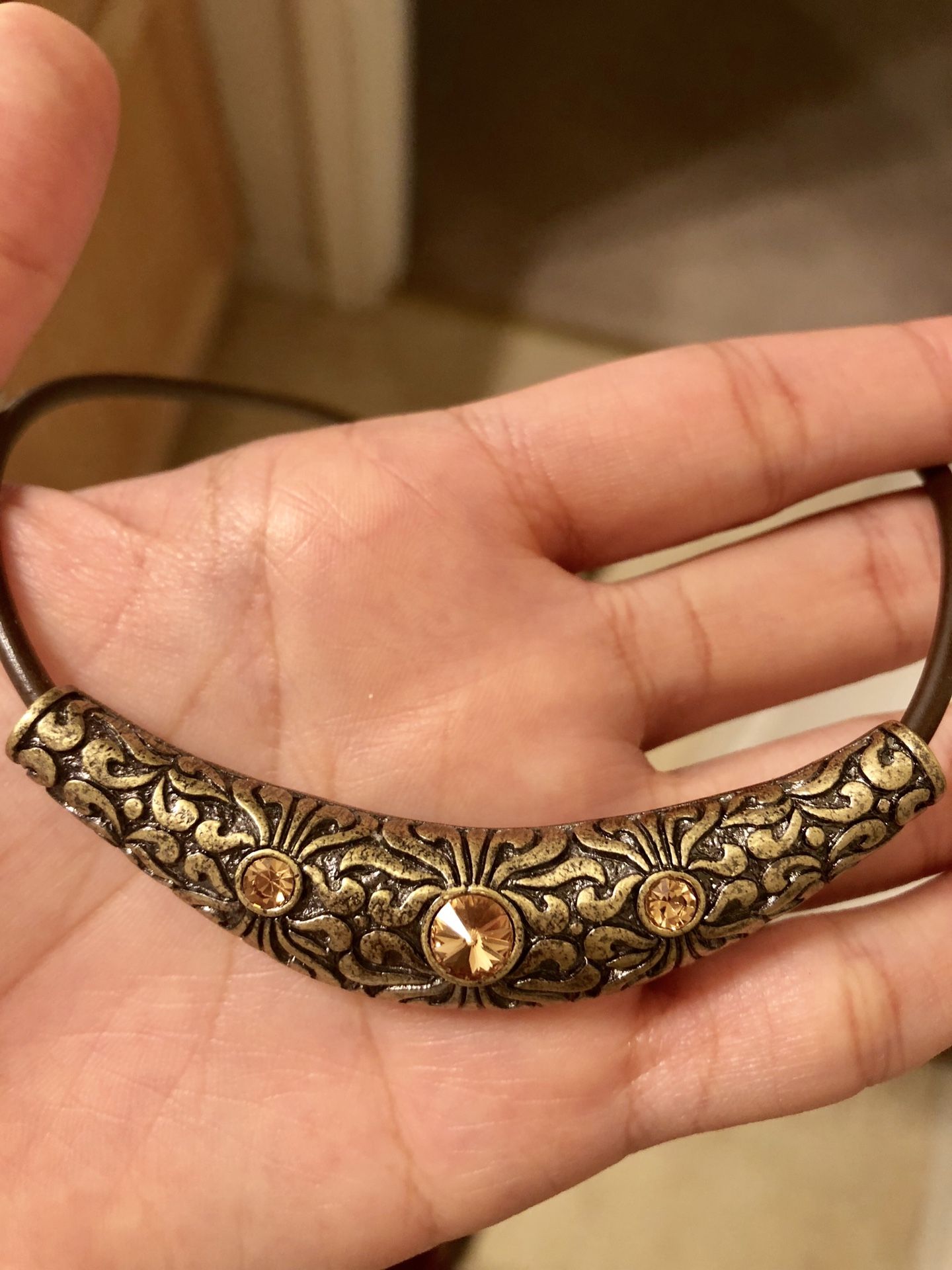 Engraved statement necklace with topaz rhinestones as accents. Has a lobster claw clasp and chain. The metal statement piece is about 2 inches long so it’s perfect for a dainty and not overpowering look.