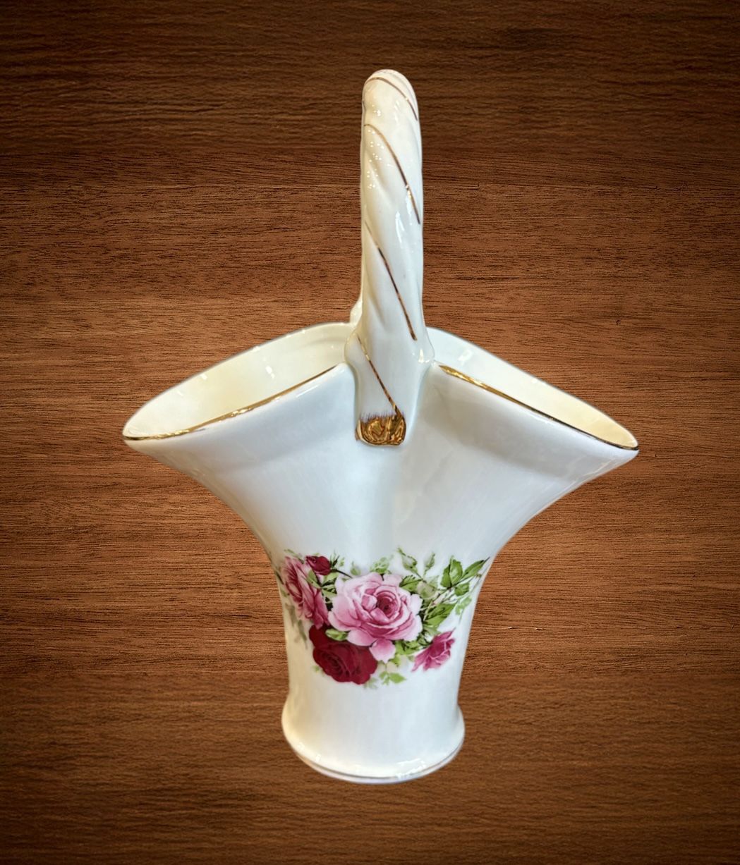 Vintage white porcelain basket with pink and red roses. Gold details.