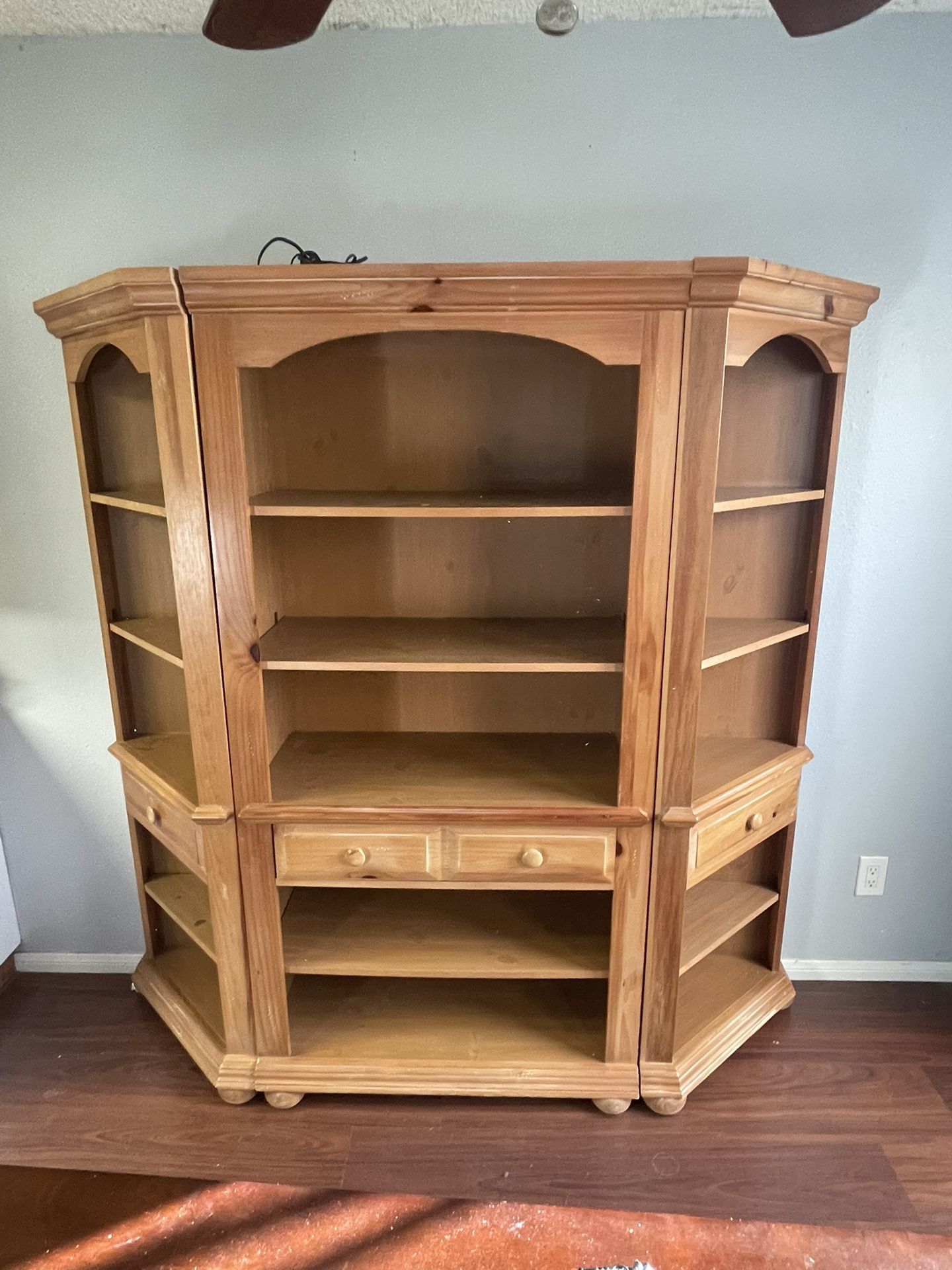 USA made by Broy Hill I have two book shelf’s and a center cabinet. Center piece has illuminated top shelf. Some normalWear but in good condition overall. Quality furniture made of pine. Original price was over 2k asking $350 for all.