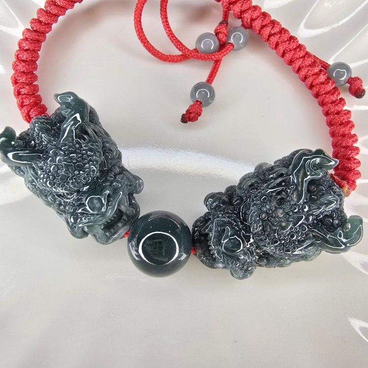 All natural blue water double dragon head Guatemalan Jadeite Bracelet Wrist is about 8inches. Bracelet is adjustable Dragon head size (each head) ~ L 24mm x H 29mm x 10mm Bead size: 11mm All natural no chemical dyes. Does not come with a certificate. Please feel free to contact me if you have any questions.