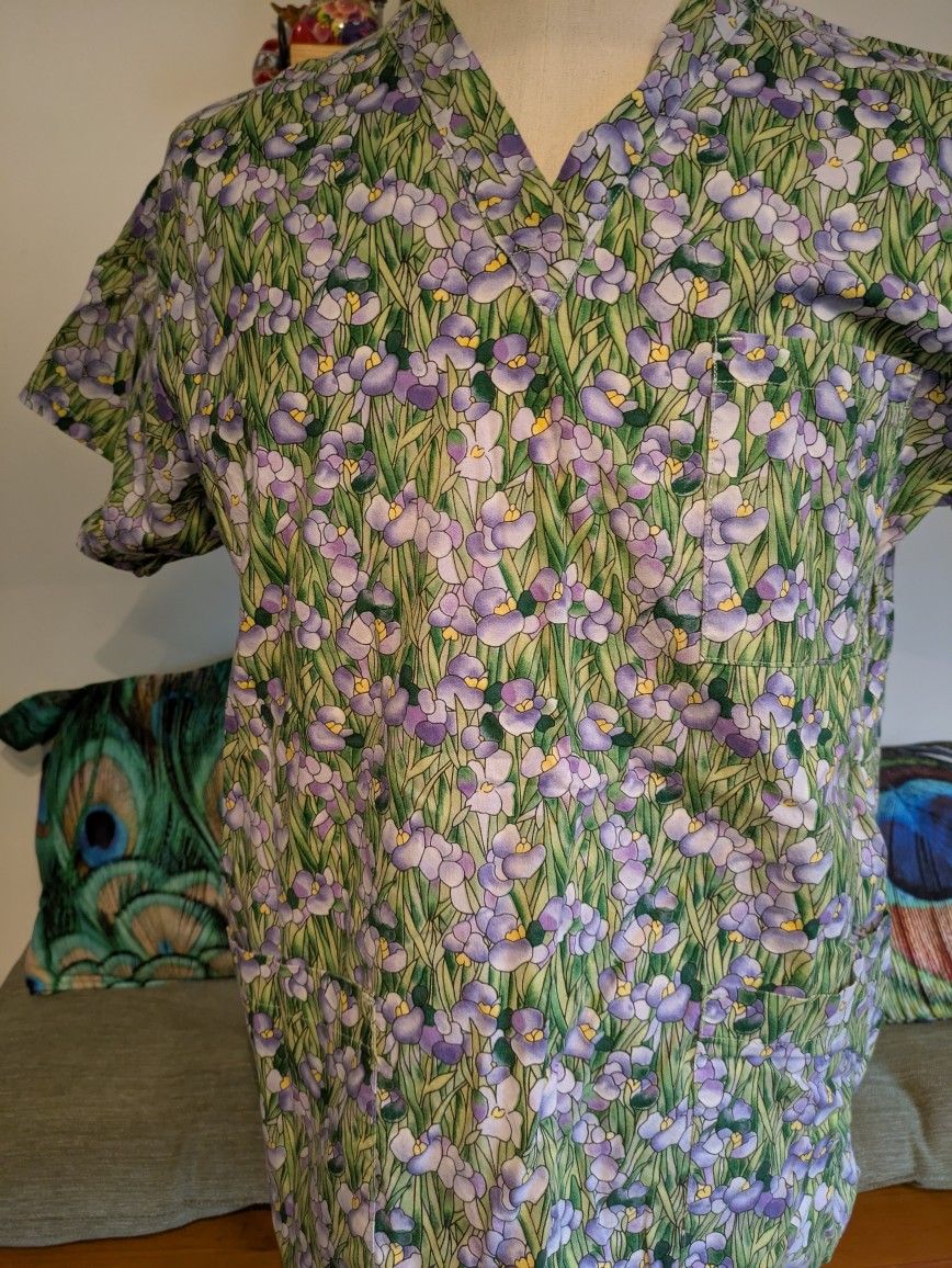 Vtg Women's Peaches Brand Lilac Pattern Scrub Top