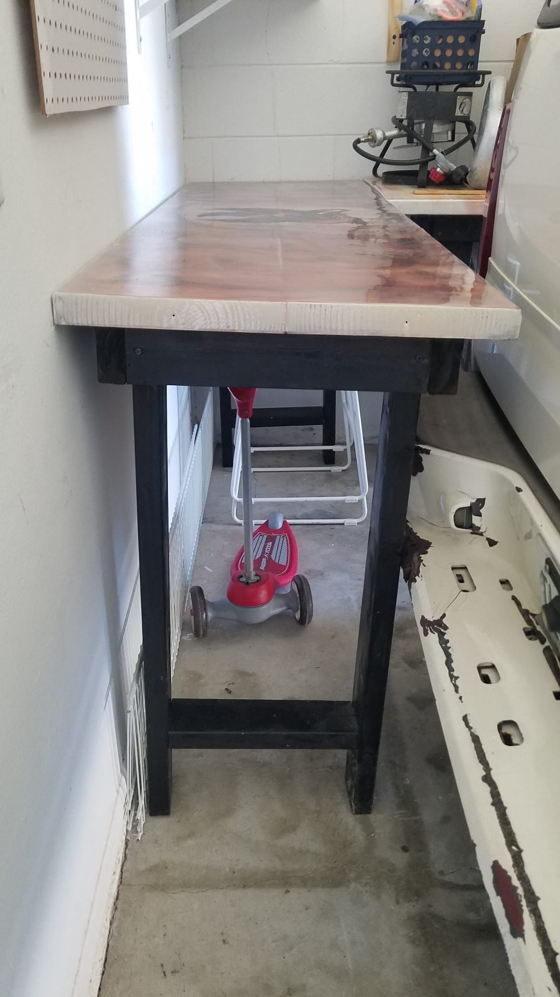 Made of Pine wood, 85 L x 22.5 W x 36 H inches. Is used but only for light work. Still in perfect condition, Resin on top.