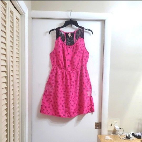 Grab this cutie today! It will probably be one of the cutest π Little dresses π in your closet when you do! She is so chic and perfect π₯° π This little number has Spandex to stretch and polyester to decorate it, the material feels like satin or silk but has some give and is very flattering of all forms and shapes! This is a Chic Pink little number with beautiful flying birds π¦ Printed designs in the fabric and lace upper shoulder area and it's a Midi/Mini Dress π with pockets! This dress π has style, class and flare! Worn only two times, it's full of life and ready to live! Make me an offer today! Have her in your closet tomorrow!