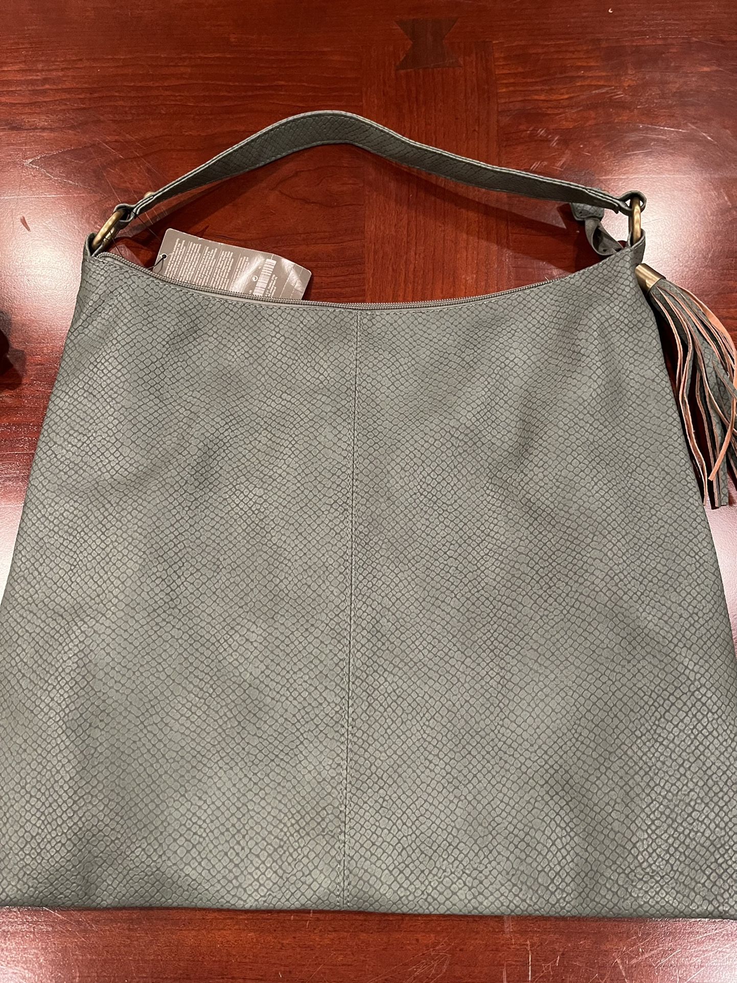 Leather shoulder bag in khaki color and a snakeskin looking pattern. Bag is new with tag from Hema Amsterdam, Netherlands. Brass tone brushed metal hardware and fringe tassel on top zipper. Inside is fully lined with pockets and zip section for extra storage. Measures approximately 15.5” by 14” and has plenty of room. Removable cross body strap is adjustable with coordinating hardware. Paid $229.