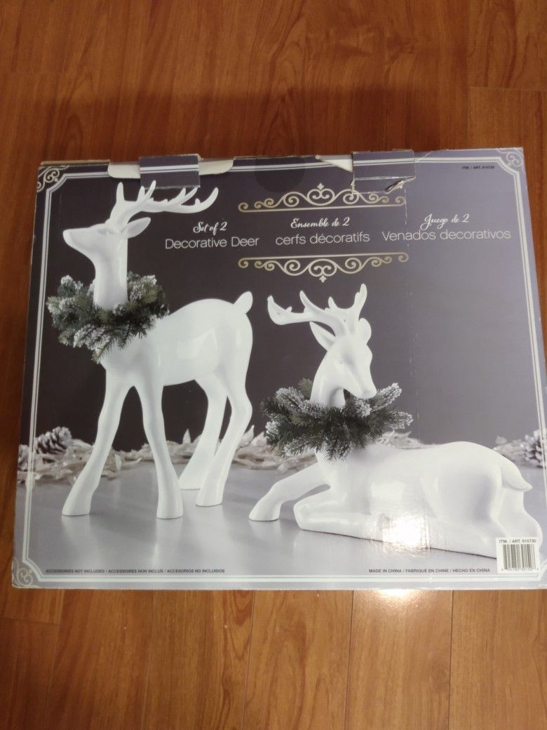 New in box. Two decorative deer. Ceramic. White about 15 inches high