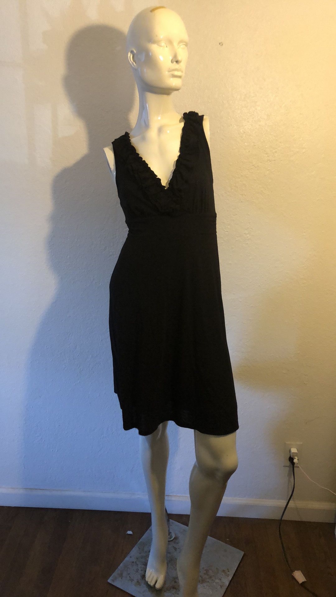 Black ruffled Deep V-Neck sleeveless dress fitted at bodice with some swing to the skirt. Skirt is lined with same fabric as dress. Size: Small ruffles at neckline travel all the way around through the back. Good condition clean no holes stains fabric: 65% Polyester 35% rayon lining: 57% Cotton 43% Rayon #191.