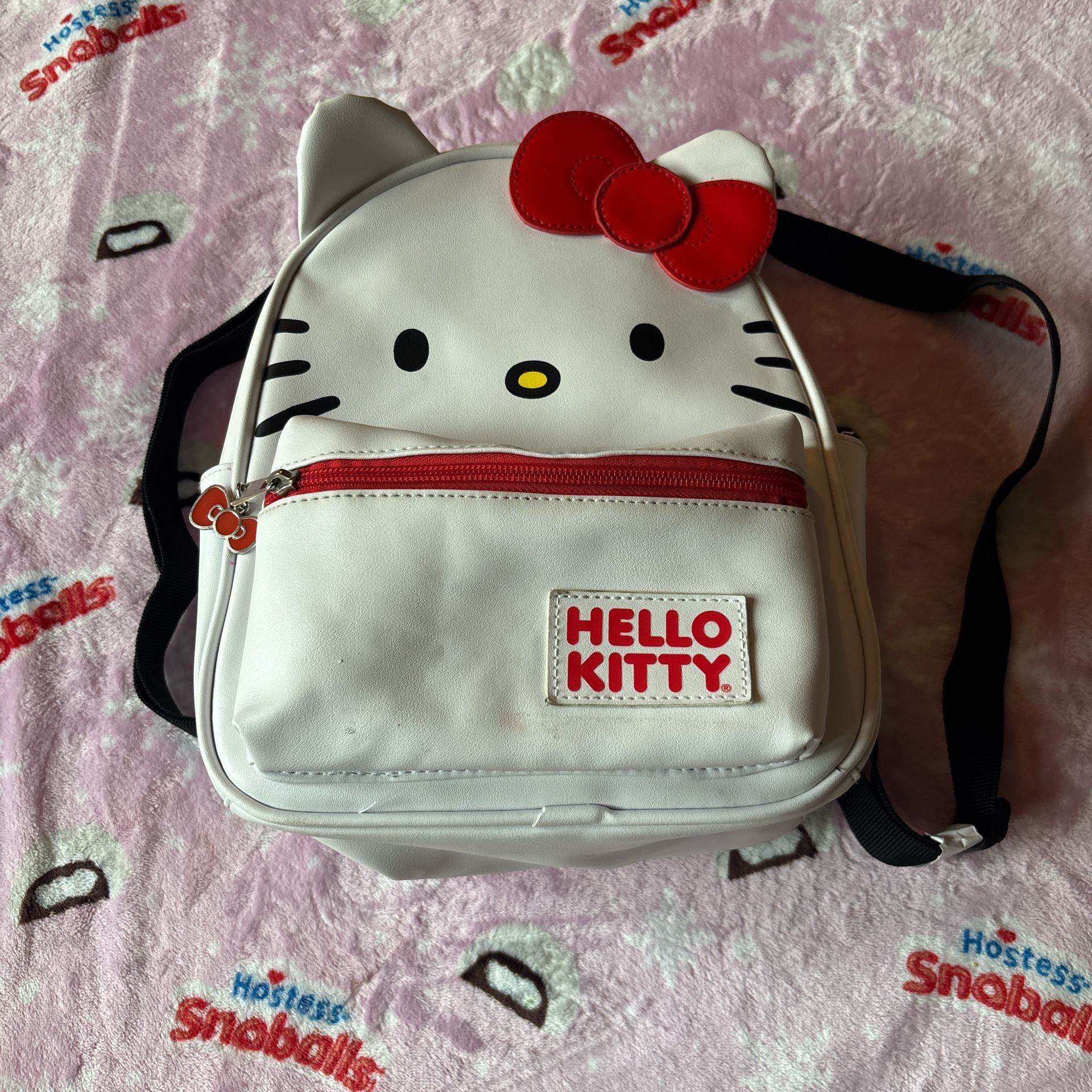 White Hello Kitty backpack with red accents. 4 pockets, 2 one the side. one in the front, and the main pocket. straps are adjustable as well.
