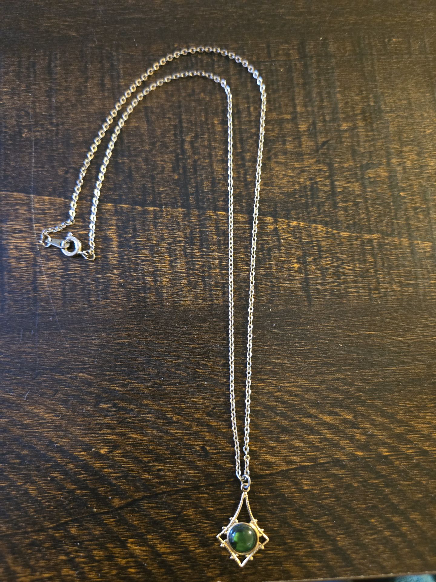 20 inch goldtone necklace (which has some tone loss) with an exquisite goldtone pendant with green stone. The pendant looks brand new. You can always switch out chain.