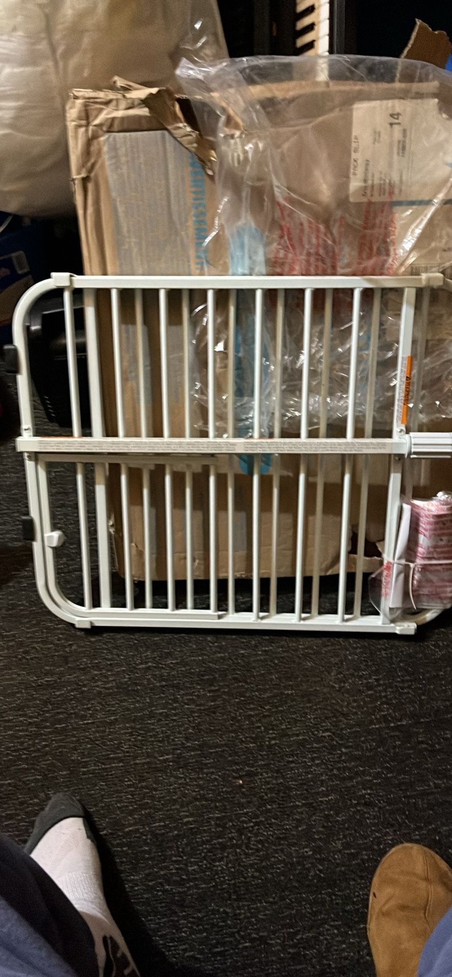 Metal gate with pet door . No opening smaller than 22 inches and no larger than 38 inches wide.