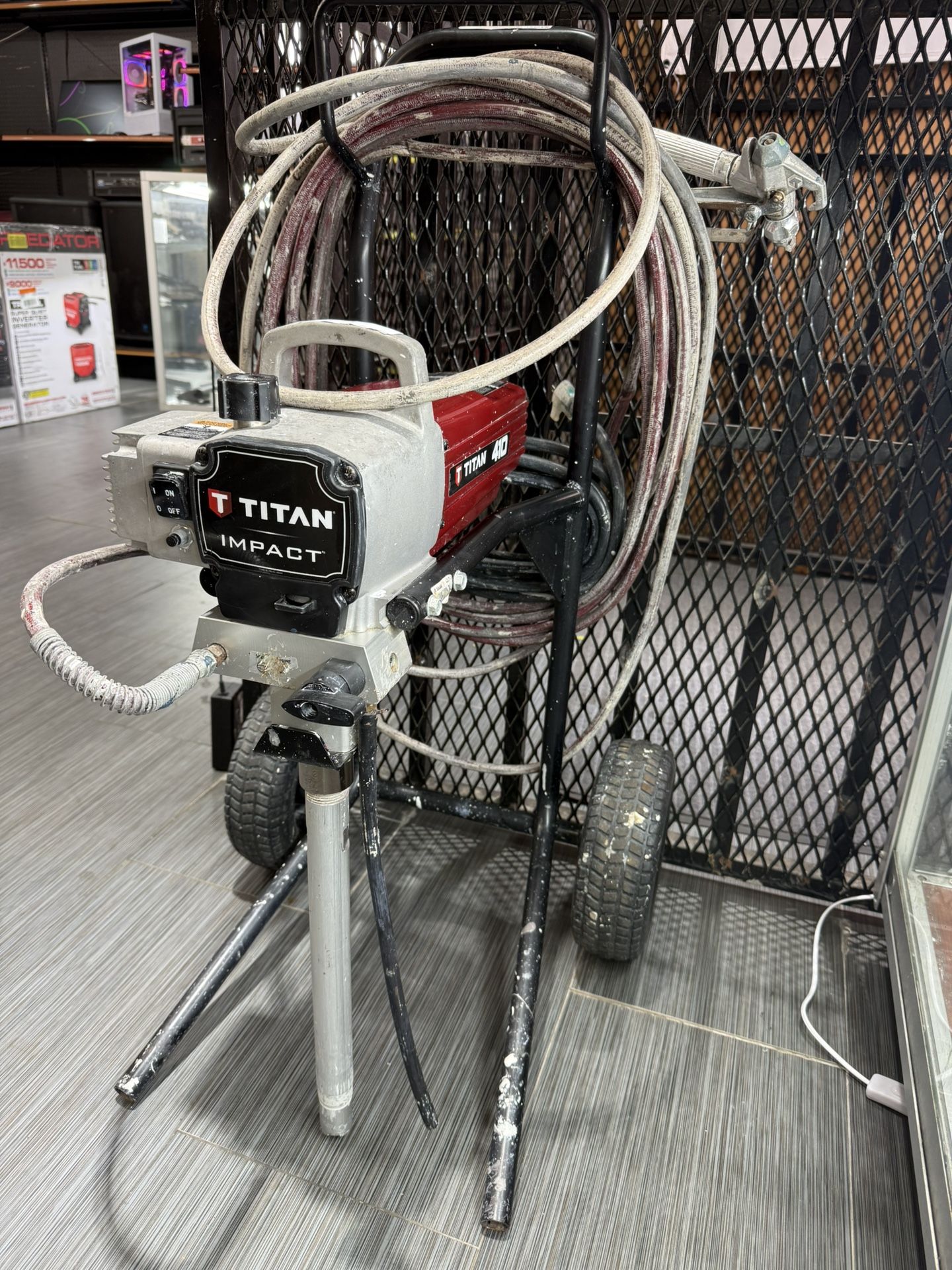 Used in great condition used a few times Titan 410 Electric Paint Sprayer High Rider with hose and spray gun has some rust but works good We are a pawn shop located at 2170 Opa Locka Blvd, Opa Locka Fl 33054, Open Monday-Saturday 9am-5:30pm Sunday Closed