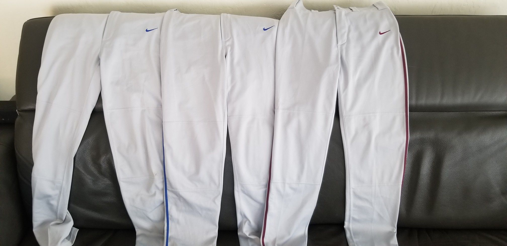 Youth Nike 'Swingman' Baseball pants. 2 Size Large (1 Maroon/Grey & One Royal Blue/ Gray) 1 Size X Large (Royal Blue/ Gray) In very good shape. No stains. Only 1 Blue/Gray pair has tiny tear in knee. From a smoke free home. Sell New for $35.00 Selling 1 Pair for $12.00 2 Pair for $22.00 Or 3 Pair for $30.00