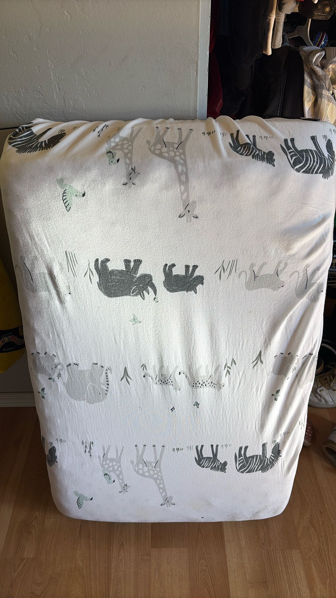 My baby brother grew up and doesn’t use the bed anymore, and we are trying to get rid of it, some chipped paint but bed is sturdy. Mattress and frame
