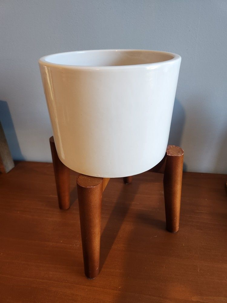 Mid Century Modern plant stand 7.5" high with white ceramic pot. Diameter 7.75" and 5.75" high.