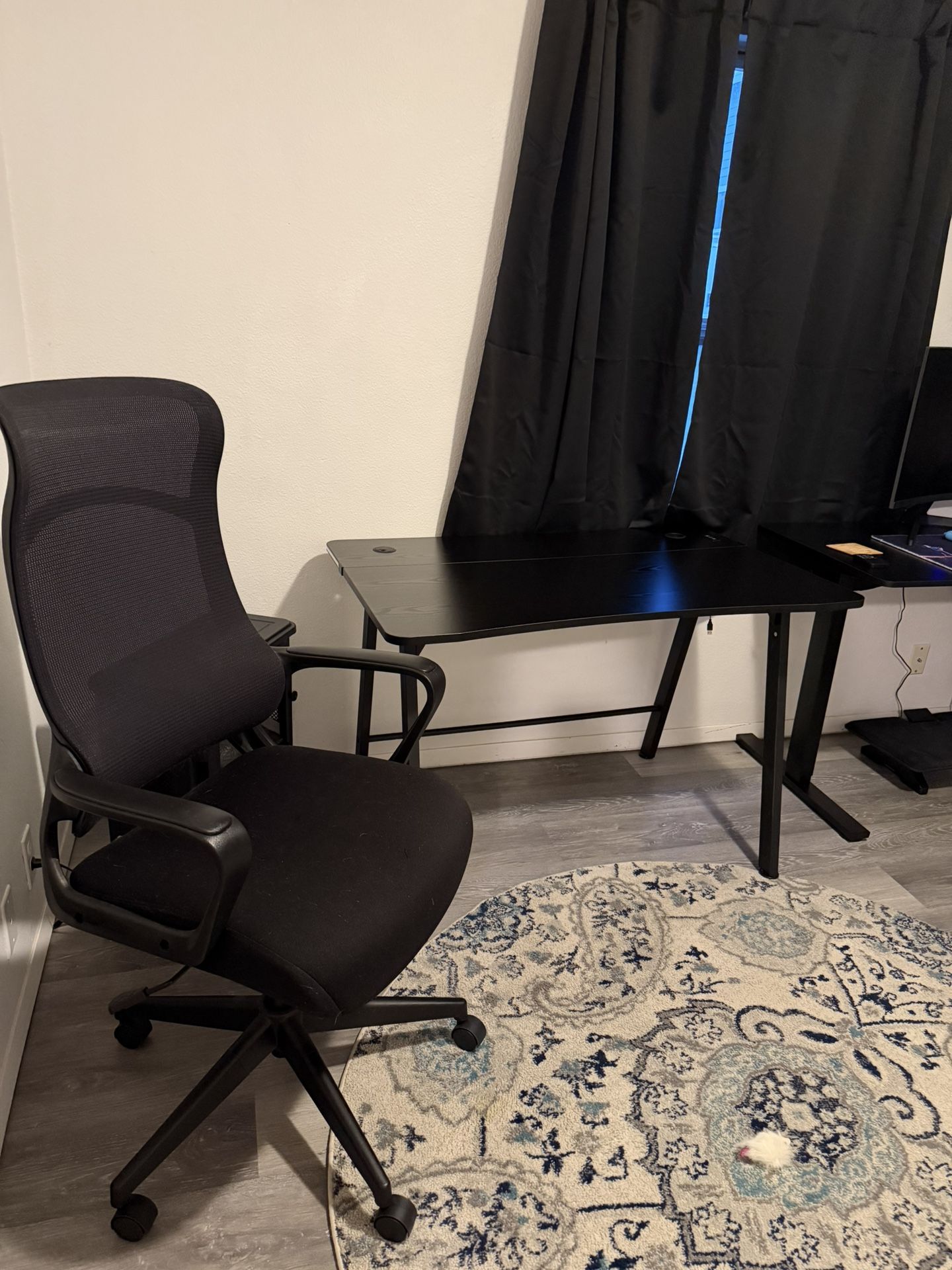 42” width x 29” depth x 30” height desk with RGB lighting. I don’t use the lighting but it’s there if you want it! Recently upgraded desk and chair, willing to sell separately as well! 20$ for the chair and 30$ for the desk Chair is from Target and is pretty comfortable. Does well for multiple hours, is adjustable. I’m a 5’11 dude who’s over 220 for reference. Have a truck and can deliver.
