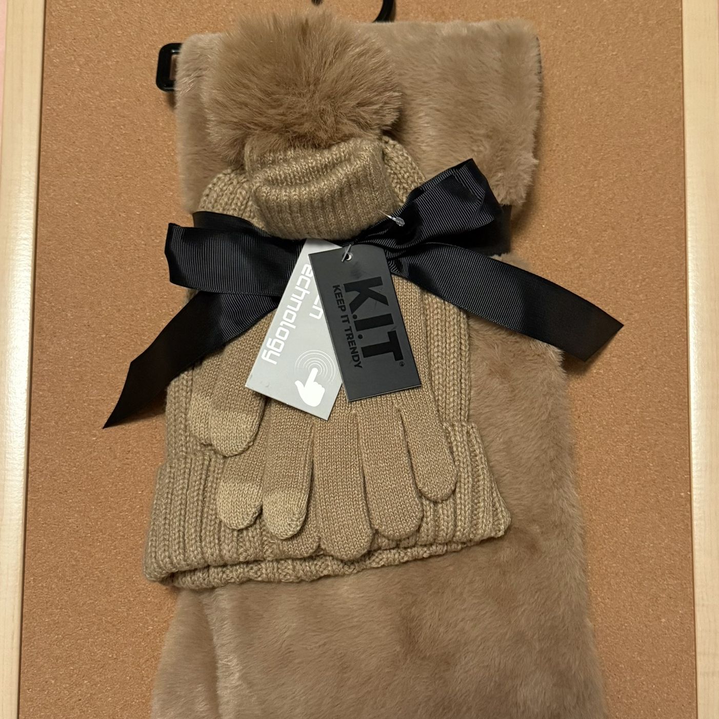 New with tags, super-soft K.I.T. Keeping It Trendy infinity scarf, pom-pom beanie and warm gloves with touch technology on fingertips of gloves. Color: taupe Hand wash No bleach Dry flat optional Low iron (optional) Cash, only (exact bills, please:)