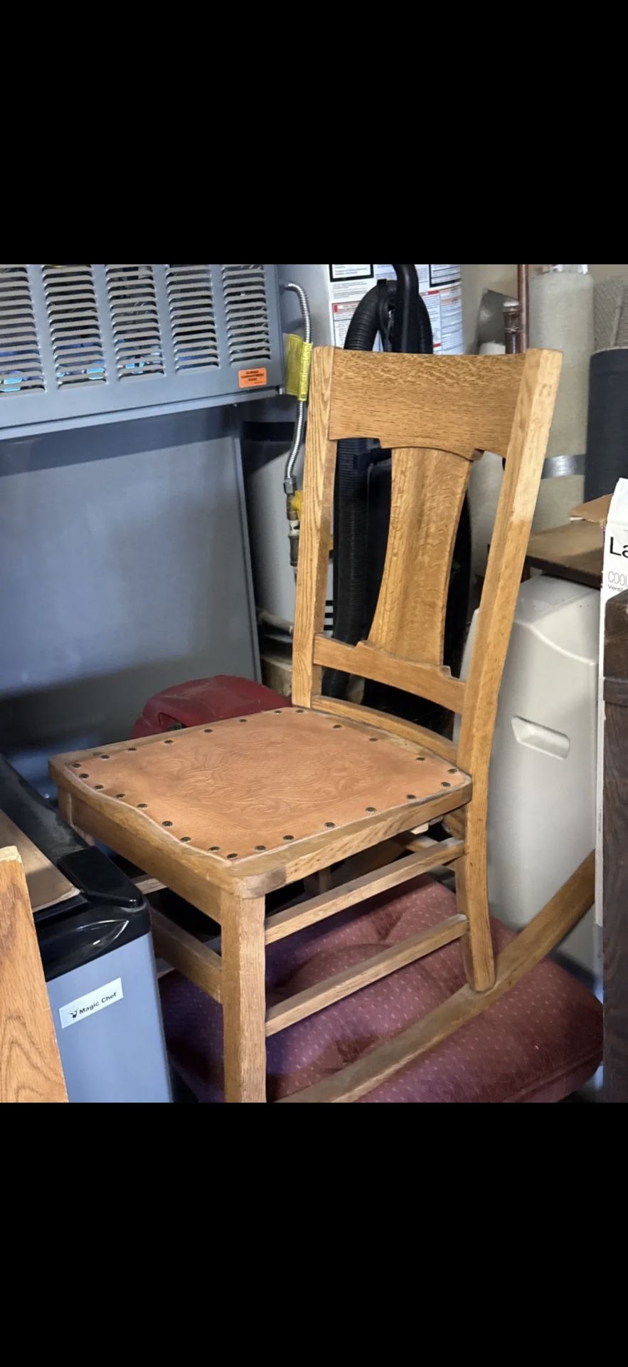 Antique oak mission rocking chair with leather seat.
