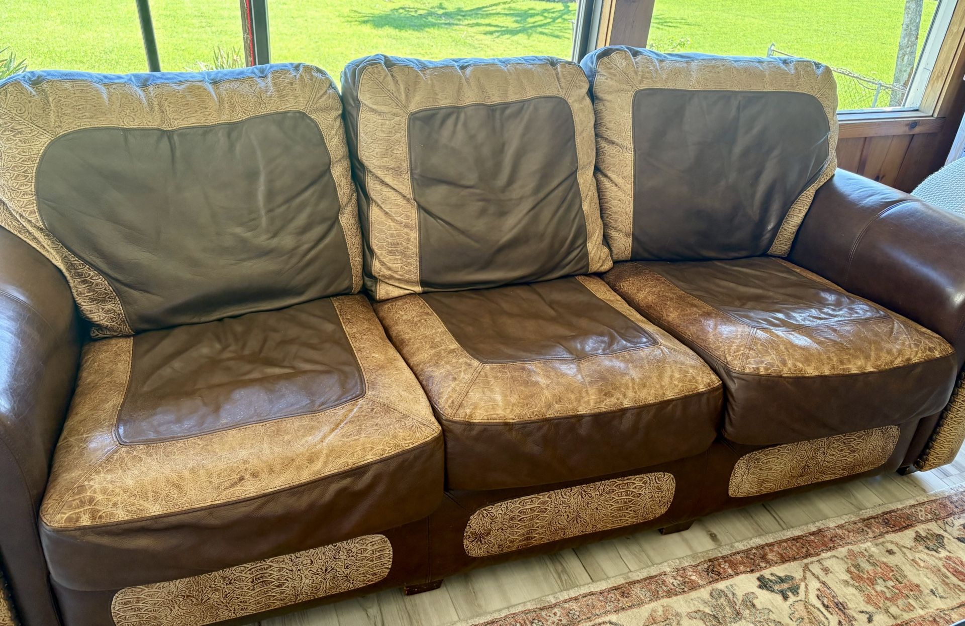 Sold Separately at $700/ or as a set for $1200. (New cost verified at $5000 per) Condition: Used and enjoyed with normal wear; maintained with leather cleaners and conditioners Details Brand: Legacy Leather, Canada’s Premiere leather furniture Color: Dark brown seating and back with light brown/cream detailed trim with design 3 fully removable cushions per sofa for ease of cleaning Dimensions: Length: 93” Height: 31” Depth: front of armrest to back of couch: 37.5” Cushion depth: 22” Premium quality leather, fully wrapped ; solid wood frame Unique contrasting leather Large Brass nailheads, all intact Pick up only; must pay in cash at time at pick up. Can store in home until Christmas if prepaid.