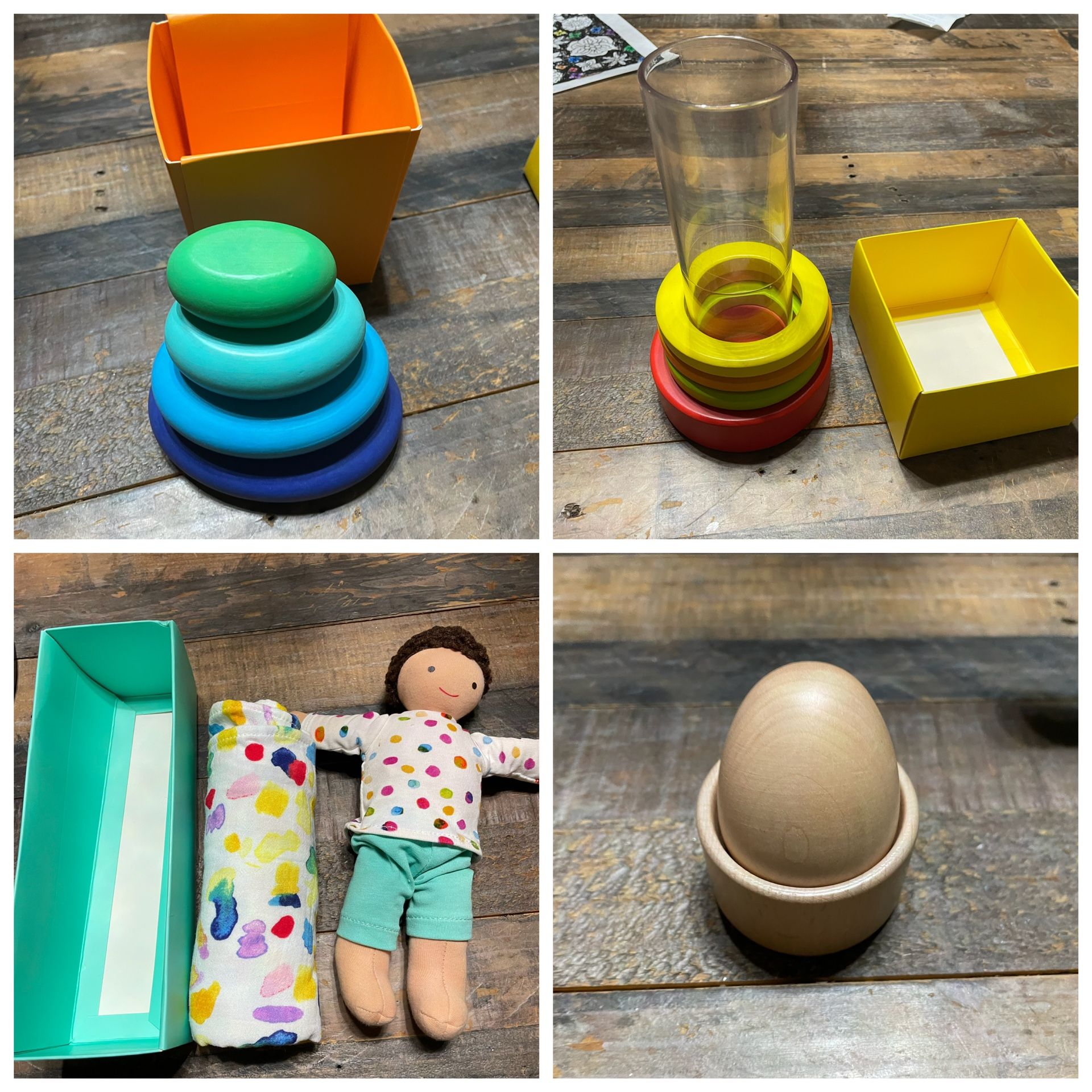 Part of the explorer play kit. Includes everything in the pictures. 1) Montessori Egg 2) Wooden stacking stones 3) peek-a-boo blanket 4) Baby Avery 5) Clear tube with stacking rings (no ball) Perfect condition, some of the items were never used! All clean! No stains no rips!