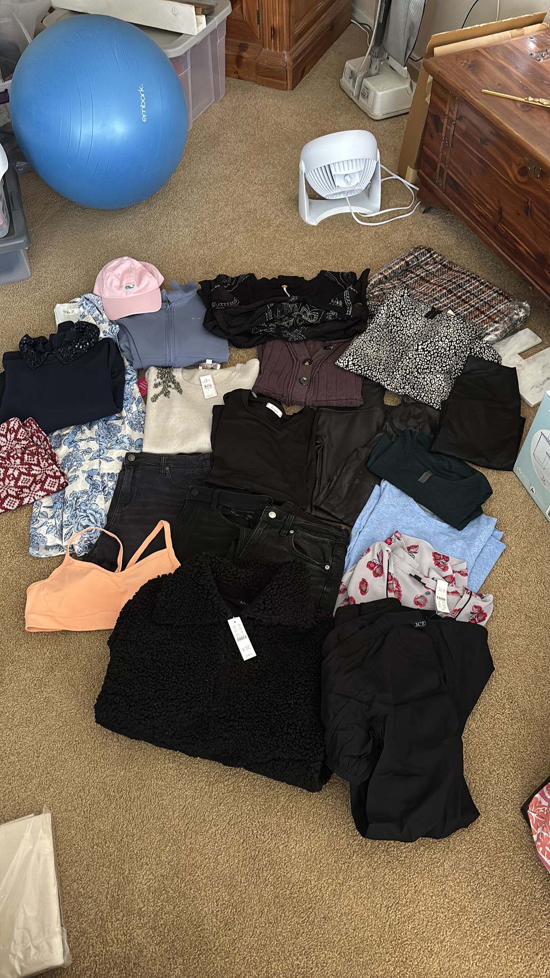 All items either new with tags or worn once! Includes: -NWT J. Crew Sherpa - black -NWT J. Crew dress - black -NWOT Athleta sports bra - orange -NWT J. Crew sweatshirt with sequin collar - navy -NWT Loft sweater - cream -Aerie black denim shorts -Ann Taylor short sleeve floral blouse -Lululemon blue workout tee -Beyond Yoga dark green workout tee -NWT Eliza J Dress - white/blue -Senita snowflake joggers - red (small but fit like a medium) -2 pairs of black American Eagle jeans, one skinny and one straight leg -Black Anthropologie tee with mesh dotted sleeves -Spanx faux leather leggings -Aerie faux leather leggings -American Freedom Co sparkly camo leggings -Blue Roxy jacket (large but runs small) -Pink vineyard vines hat -NWT plaid blanket scarf -NWT Anthropologie leopard blouse -Purple free people tee (small but fits like a medium) -Black lace sleeve free people top (small but fits like a medium) Smoke and cat free home! Upgrade your wardrobe with one purchase!