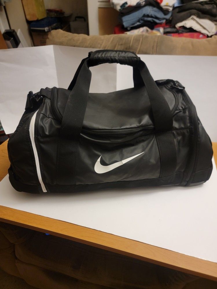 Nike elite bag in a great black, it has pockets on both ends and a snap pocket inside, there is a zipper pocket on the outside, it has the shoulder strap and the velcro for the handles, very nice bag but needs a good cleaning, Please see pictures for best description and condition I do not ship or deliver Cash only please It is approximately 24"×12"×12"