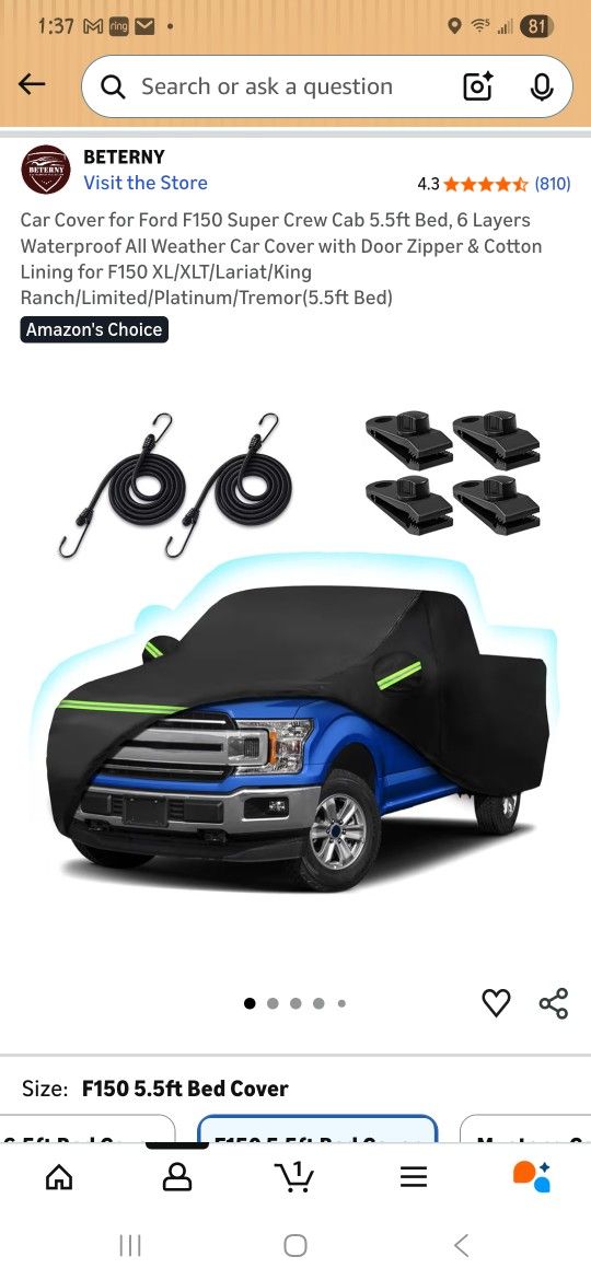 Ford F150 Super Crew Cab 5.5ft Bed Car Cover Purchased a few years ago, only used a handful of times. In excellent condition. 6 Layers Waterproof All Weather Car Cover with Door Zipper & Cotton Lining for F150 XL/XLT/Lariat/King Ranch/Limited/Platinum/Tremor(5.5ft Bed) $50 Pick Up Beaumont, CA Cash, Zelle or Venmo
