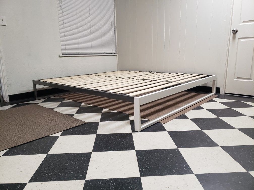 Only $200, about $600 new. A quality Keetsa brand, provides robust support and superior strength for maximum stability. White foot board / headboard currently facing out, can be turned to have the silver side facing out if you prefer. Simple quality steel platform frame consists of a metal head board / footboard, side rails, middle center support and wooden slats cross bars foundations supports. No box spring foundation support required, all you need is the mattress. Eastern King cama sin colchon, no requiere base. Pickup or I can deliver almost anywhere for $20 extra.