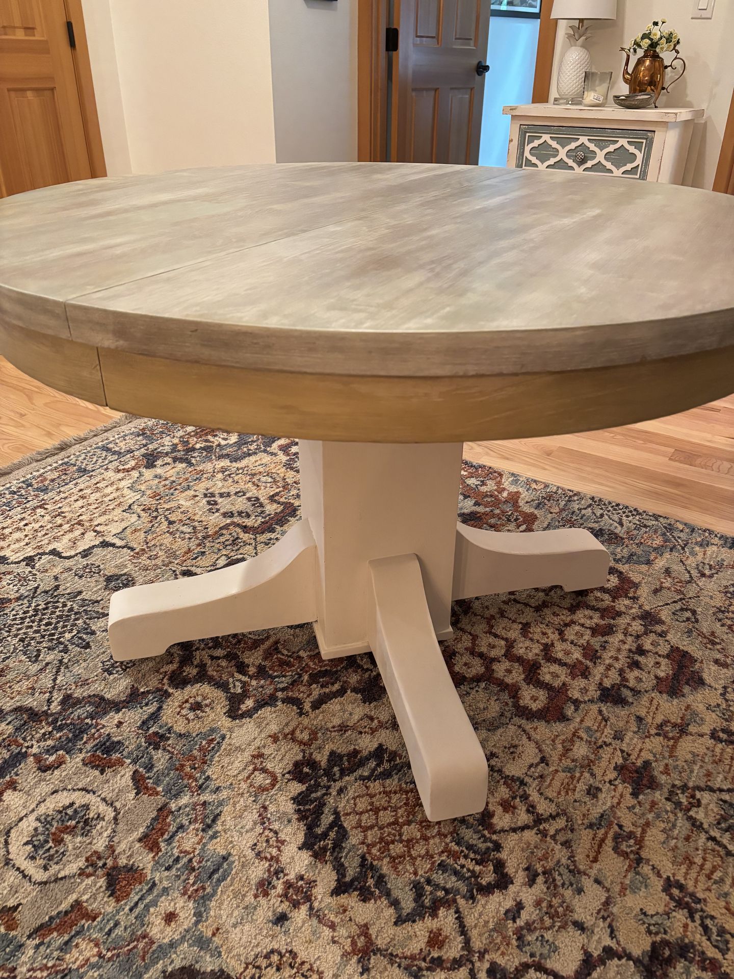 Carmen Manufacturers Portland Oregon 1938 tiger oak 45 inch diameter 30 inches high Dining table on original casters Top had some cosmetic imperfections so it was layer painted to keep some of the integrity of the wood grain and adding some coastal boho cottage vibes Chamomile, serenity blue, antique white, sealed with 3 coats of finishing wax. Base is painted antique white also finished with wax. Side rim is in a chamomile wash for contrast Chairs and decor not included