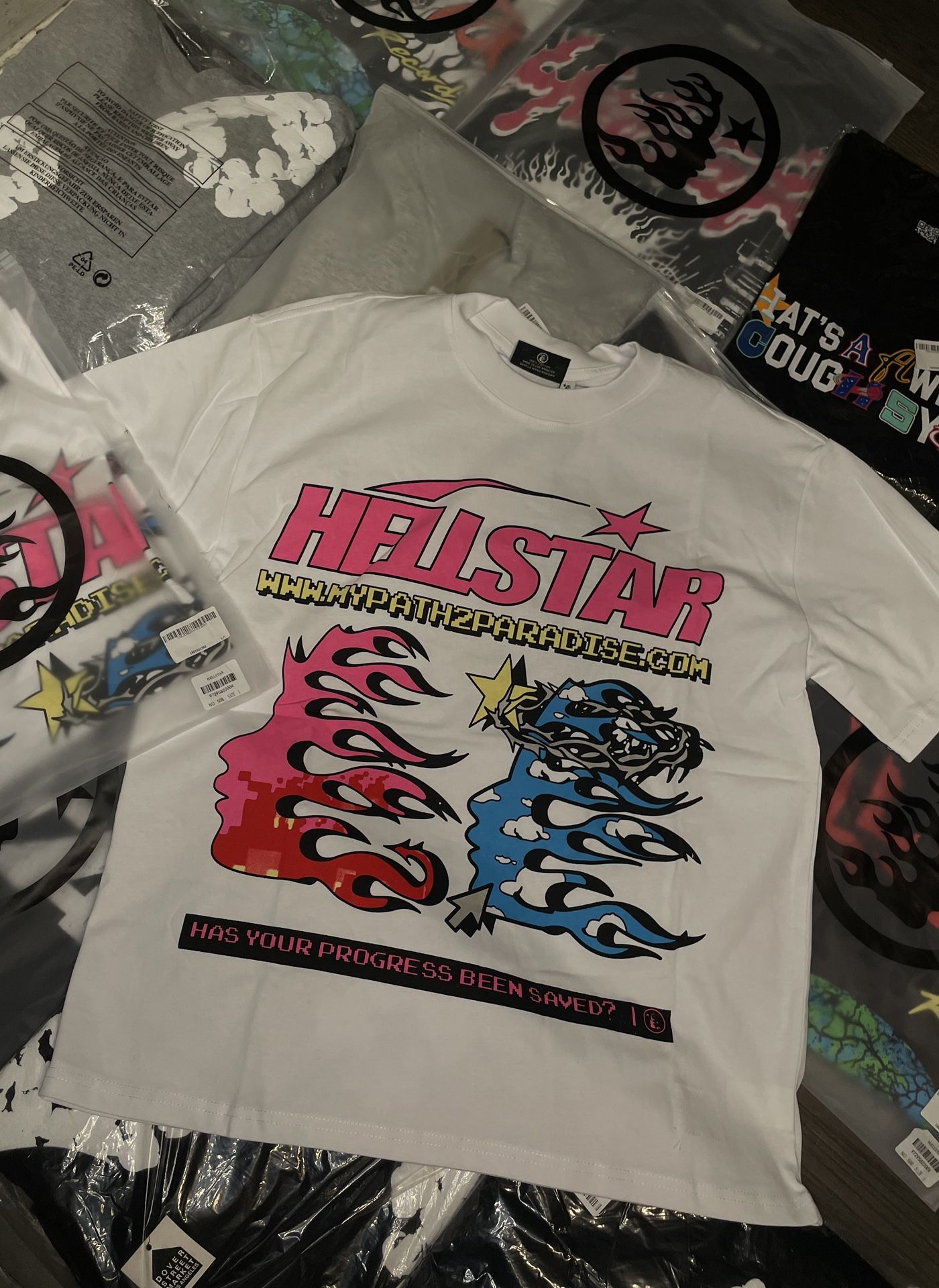 white graphic tee, hellstar design, goth fashion, grunge style, band tee, oversized, vintage-inspired, distressed, alternative clothing, music fan
