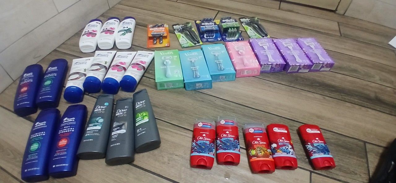 Head and shoulders Shampoo and Conditioners Dove Men 2in1 Shampoo and conditioner Old Spice Men Deodorants Gillette Venus 5 and 3 Blade Razors includes extra a cartridges Gillette Mach3 Sensitive 3 Blade Razors(3Pack) Gillette Sensor 5 Blade Razor (2Pack) Gillette Sensor 3 Comfort (3Pack)+ Sensitive with Aloe (7Pack) 68297