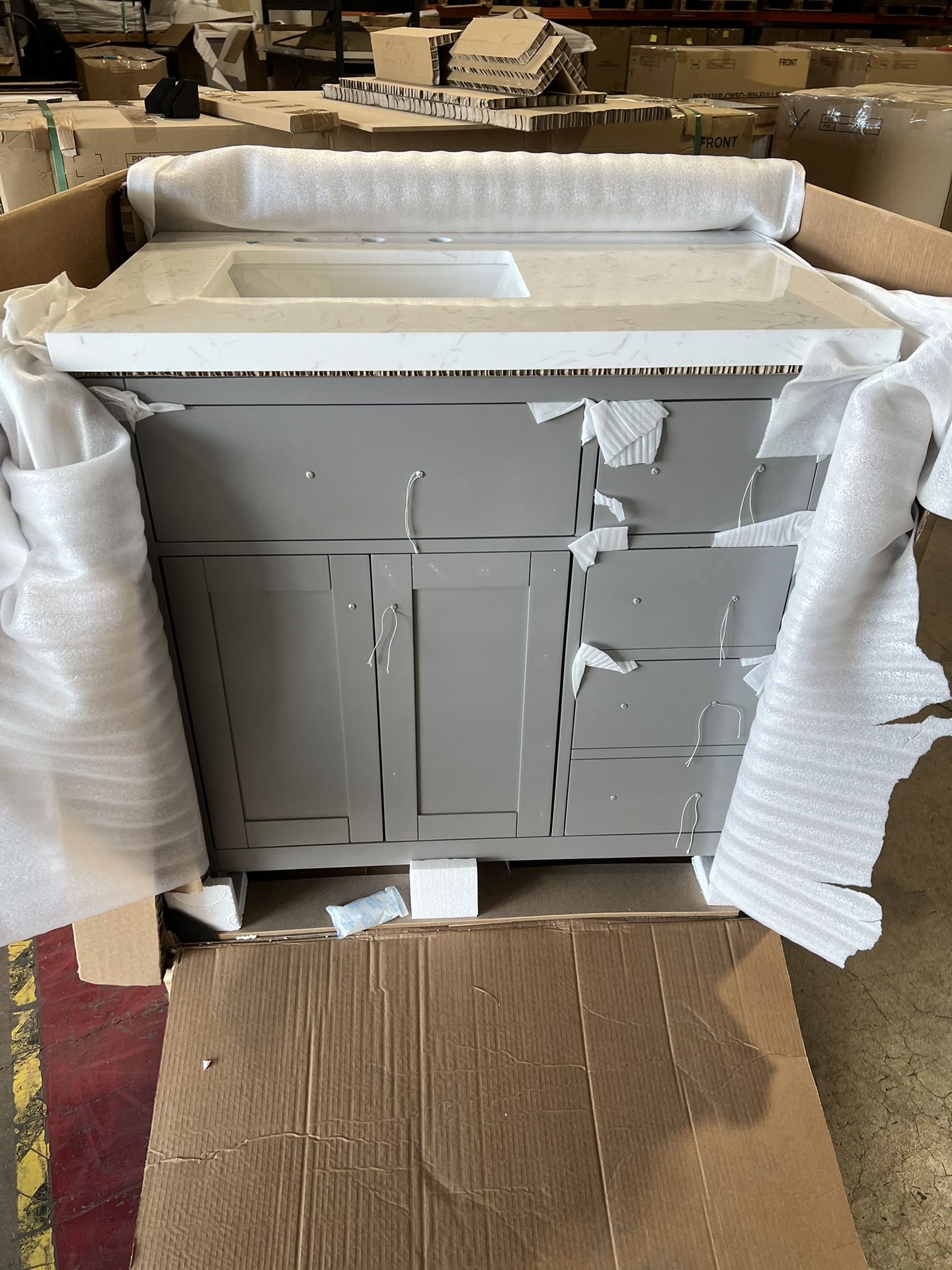 *Has some minor defects Soft closing doors & drawers. Brushed nickel handles & knobs included. Matching backsplash included.