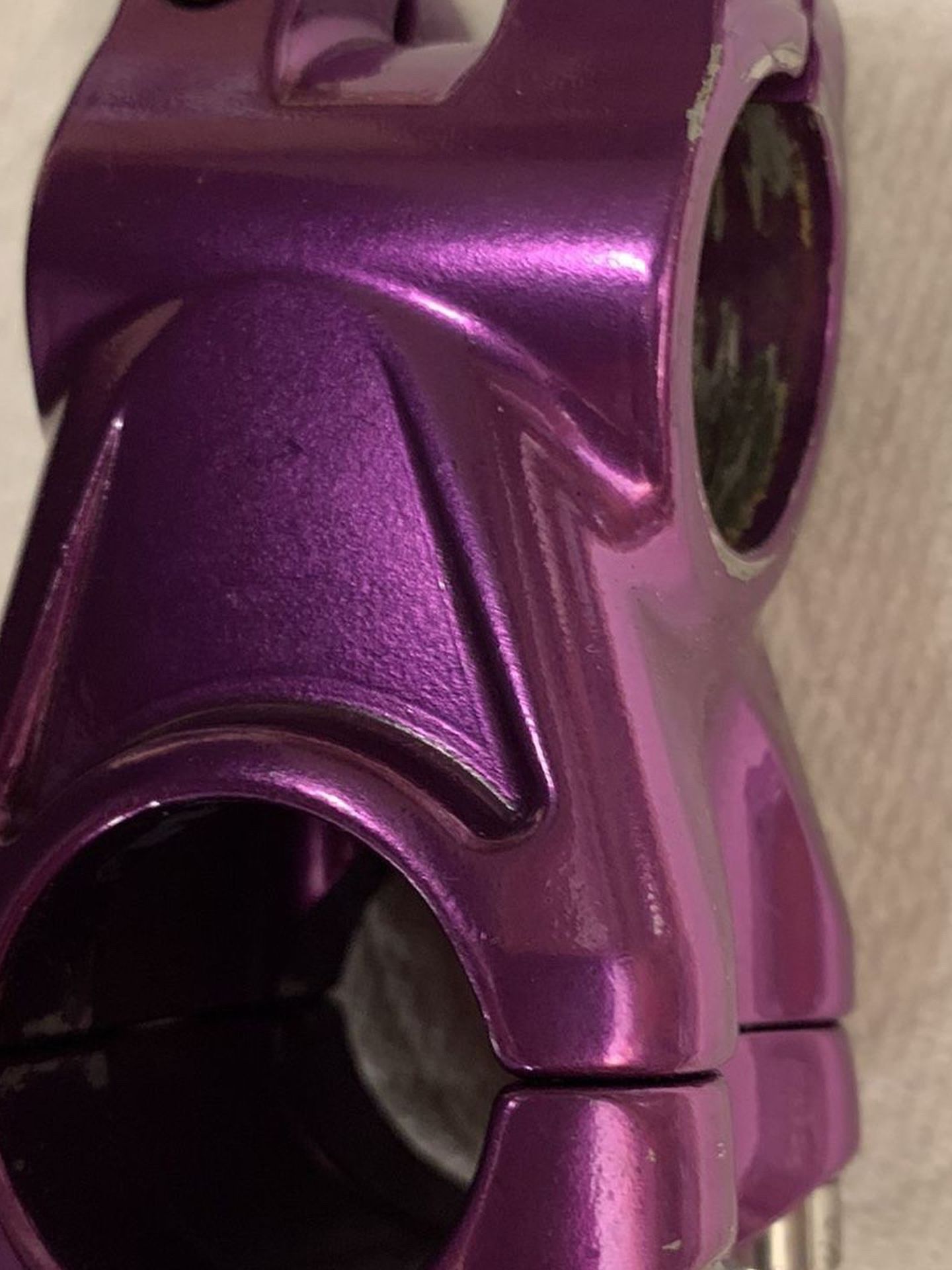 Big Roc 57SATB12P bicycle Stem, 28.6X50mm, 31.8mm Bore (handlebar) 1 1/8 Steerer tube Aluminum Alloy Purple Matching bike tire valve caps Mechanically fully functional Light scuffs from normal use $5 cash pickup only First come first serve No holds Specialized Trek Giant Santa Cruz Schwinn Mountain bike road bike dirt jump jumper