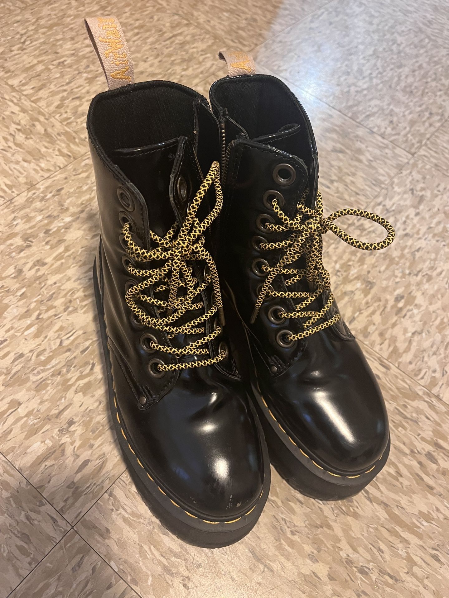 Doc martens vegan platform boots, US woman’s size 8 (unisex) Worn less than 15 times, for short periods. Very little scuffing. Still has the box and extra laces, I just need to down size hate to see them go. You MUST be able to pick them up. (MONTEREY CA) Cash is strongly preferred. Can use Venmo if needed.