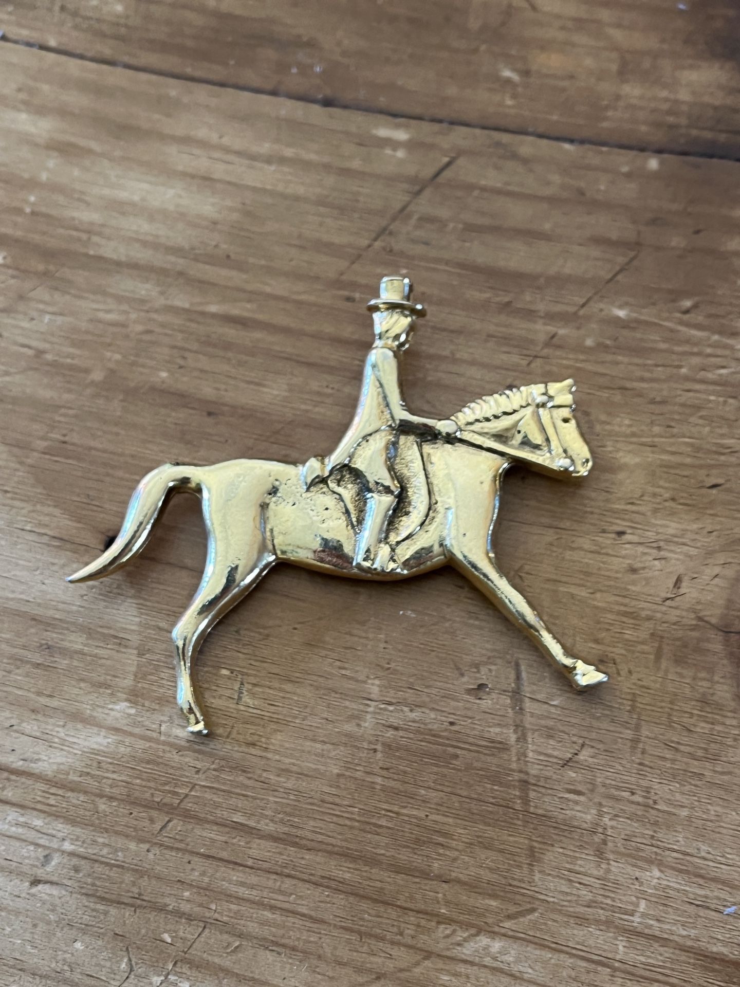 Add a touch of elegance to your outfit with this vintage goldtone equestrian horse rider/jockey brooch pin from ACCESS. Made from high-quality pewter, this original piece features a beautiful horse shape in a flush setting style. The brooch is 3 inches in length and comes in a stunning gold color. The item is signed and made in Great Britain, adding to its vintage charm. This unisex brooch is perfect for any animal lover and is ideal for those who appreciate handmade pieces. Get your hands on this undated brooch, perfect for adding a touch of timeless class to your jewelry collection.