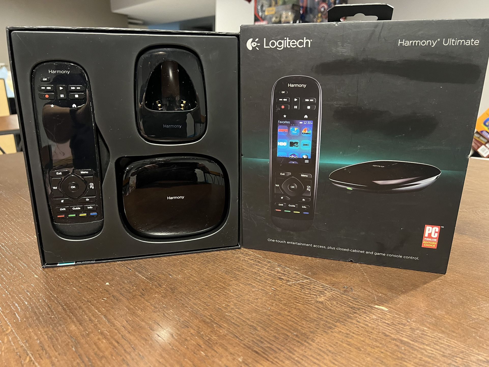 Looking for that ALL-IN-ONE universal remote? Send an offer! Well here is the find for you! The Logitech Harmony Ultimate is a high-end universal remote system, featuring a color touchscreen, customizable buttons, and a central Harmony Hub that uses Wi-Fi, Bluetooth, and IR to control up to 15 entertainment devices, even hidden behind cabinets, allowing for "Watch TV" or "Listen to Music" activities with one touch and integrating smart home items like Philips Hue lights. Comes with all the pieces.