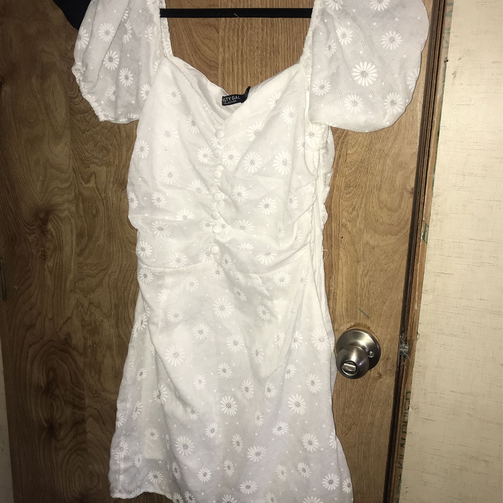 Nasty gal V-neckline, puff sleeves, mini silhouette, gathered design at bust and torso, button-down detailing at front, zip closure at side, and daisy print with perforation throughout.