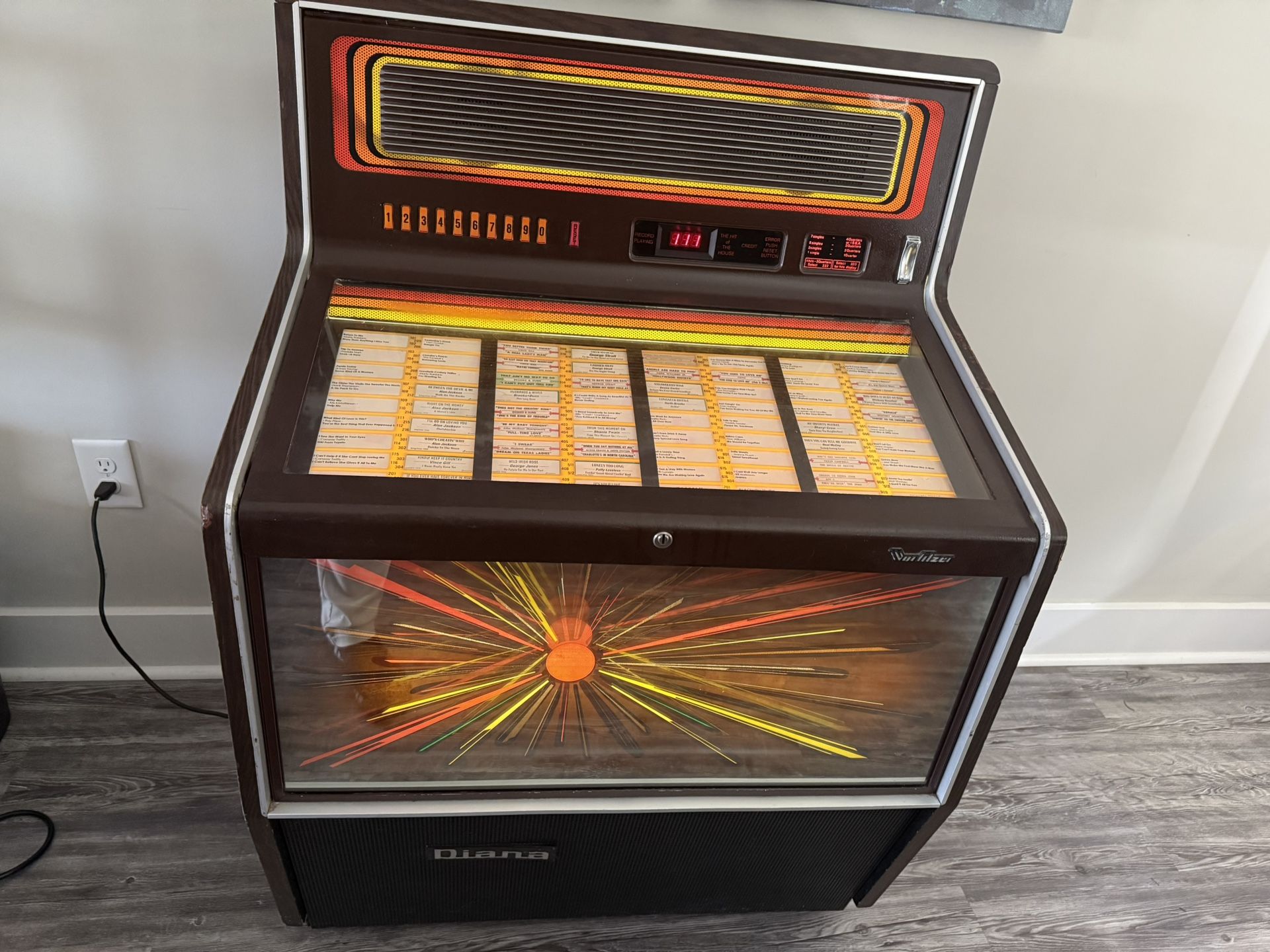 Vintage Wurlitzer Diana jukebox. Powers on and lights up but does not make selections or play. Sold as-is for parts or restoration. Very heavy. Ground level pickup. Bring help and a truck.