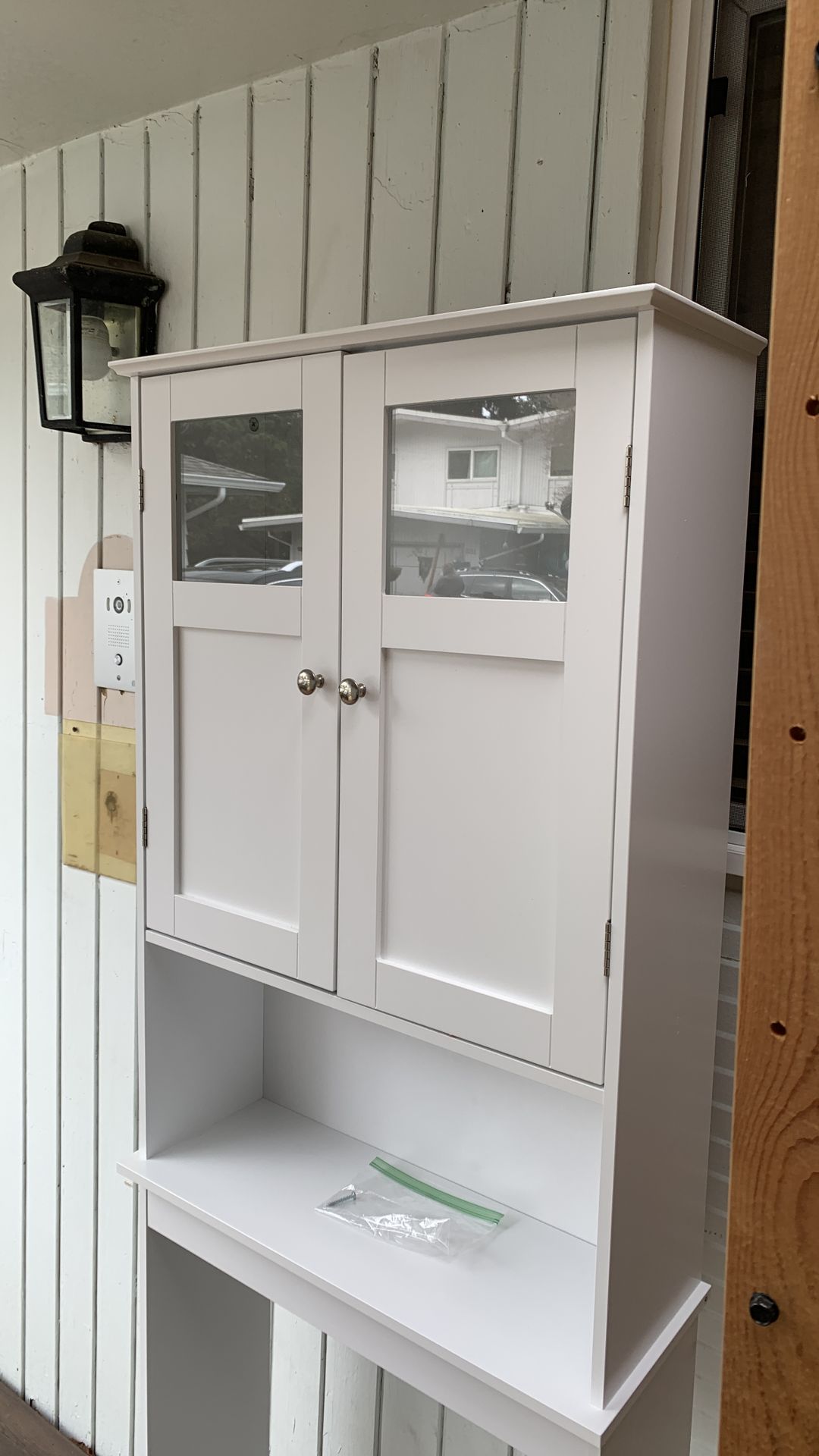 Over the toilet storage cabinet - white with glass inserts in upper cabinet. 1 adjustable shelf. 23” wide X 9” depth X 68.5” tall. $10.00 OBO Good condition. 1st come 1st serve. No holds. If ad is still showing then cabinet is still for sale.
