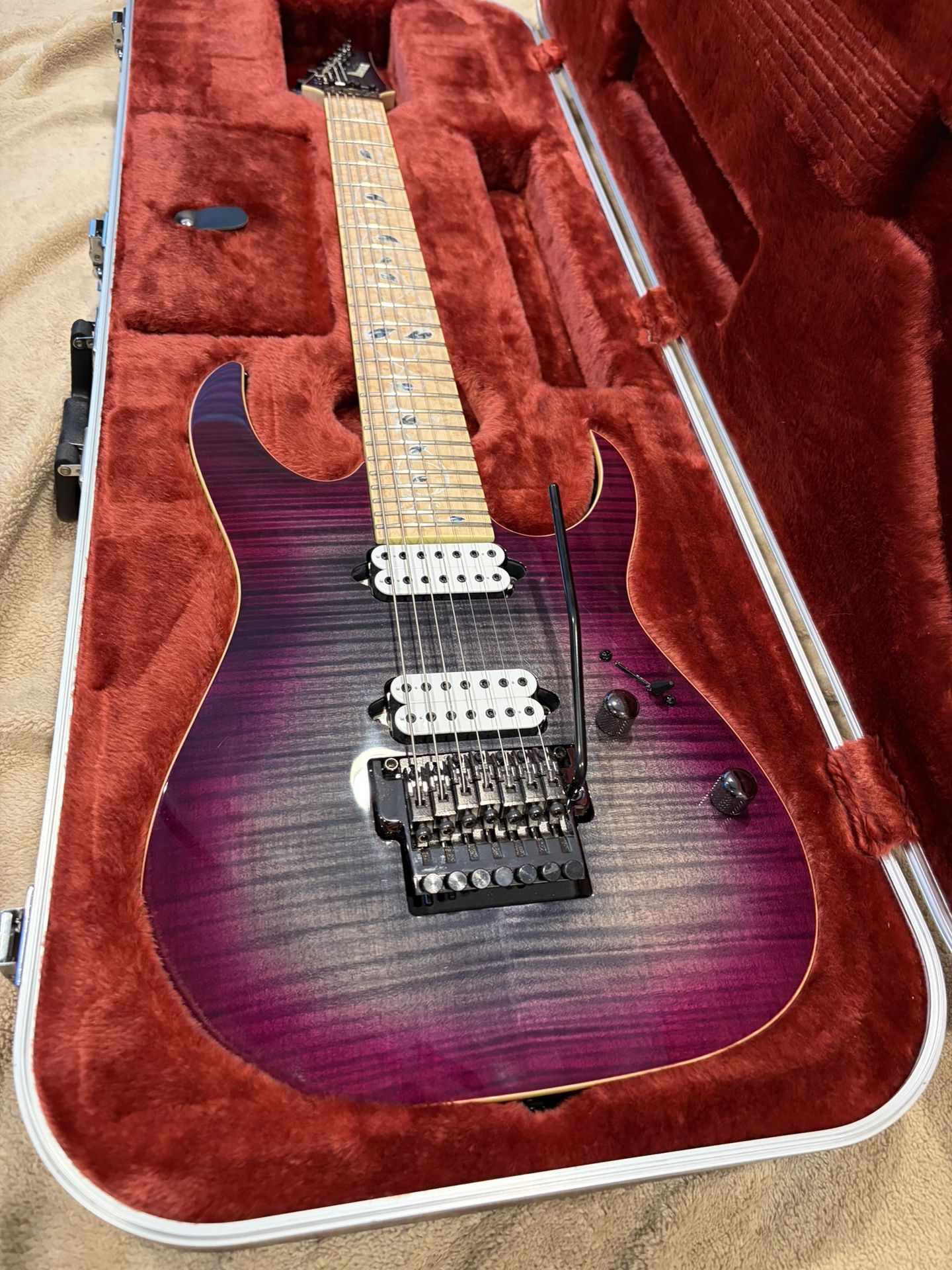 Selling my limited rg752 prestige from the wired guitarist limited run. I believe there were less than 100 of these. And only 40 of the 7 string with a tremolo . This is number 12. Ibanez edge lo pro tremolo. The inlays are decals and can be removed. Birds Eye maple fretboard. Bare knuckle warpig pickups.