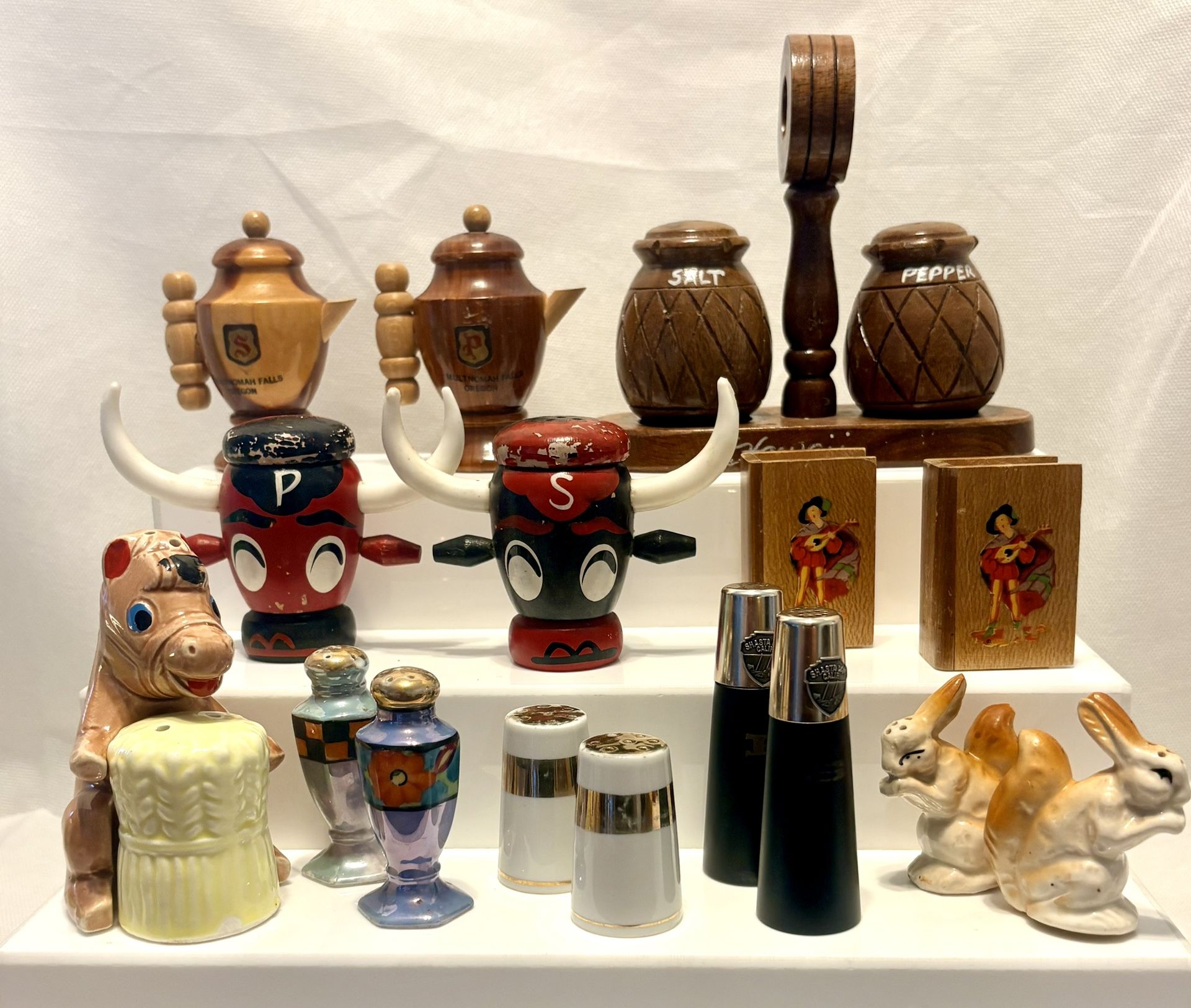 Salt & Pepper Vintage Shaker Sets #1 9 sets - $10.00 PER SET Top Row - Wooden Pitchers Oregon souvenir & Wooden Pineapples on stand Hawaii souvenir Middle Row - Wooden Bills & Wooden Books Bottom Row - ALL MADE IN JAPAN: Donkey holding hay (ceramic), Blue Lusterware (ceramic), White w/Gold band (ceramic), Shasta California souvenir (Resin) & Bunnies (ceramic) ALL in excellent condition; no chips, no cracks, just moderate wear for their age.