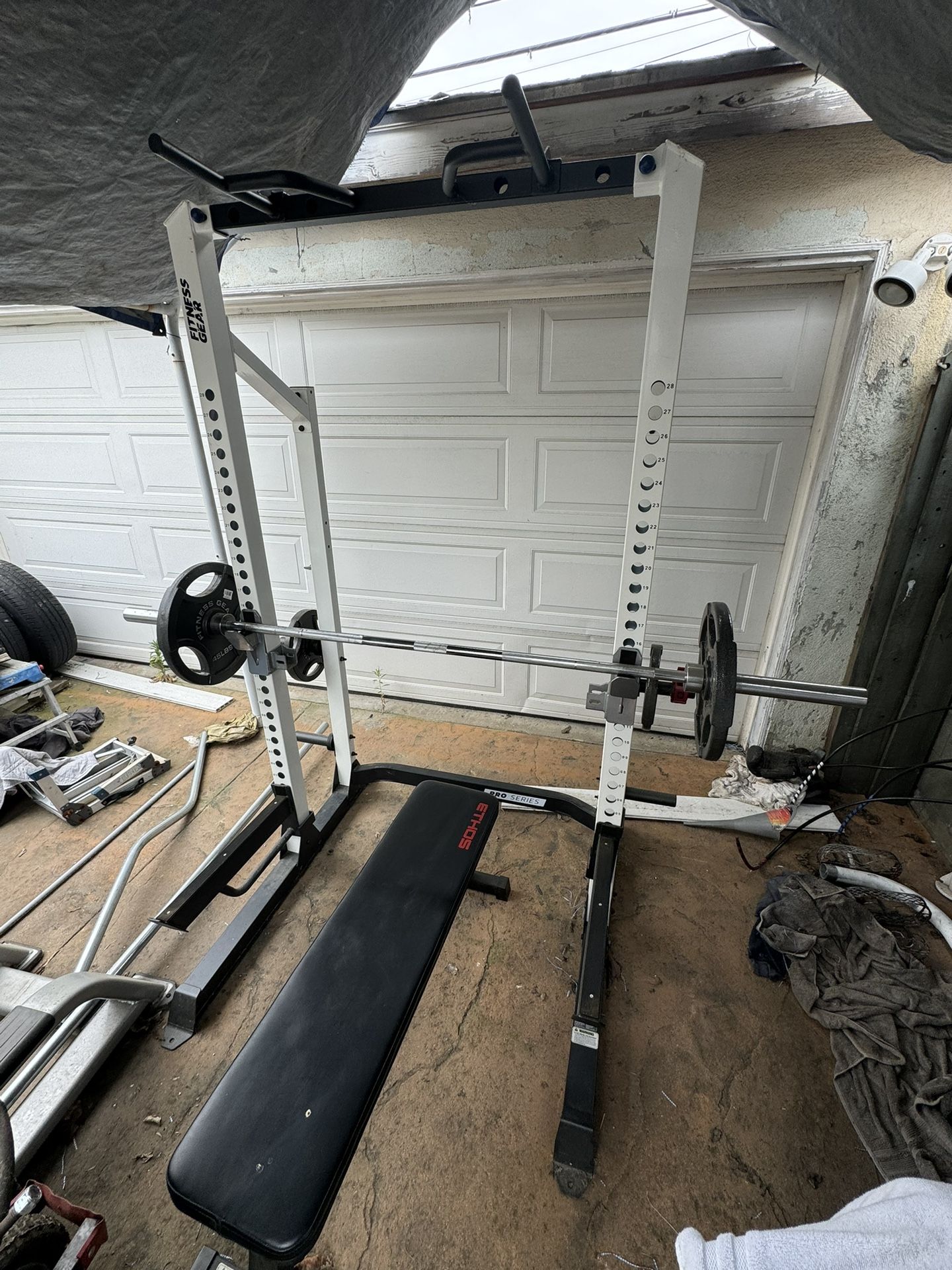 New bench press heavy duty comes with bench 2 45lb weights And some other weight Comes with barbell and clips This is a new bench press just dusty from being outside i moved to apartment at my friends house need to get rid of