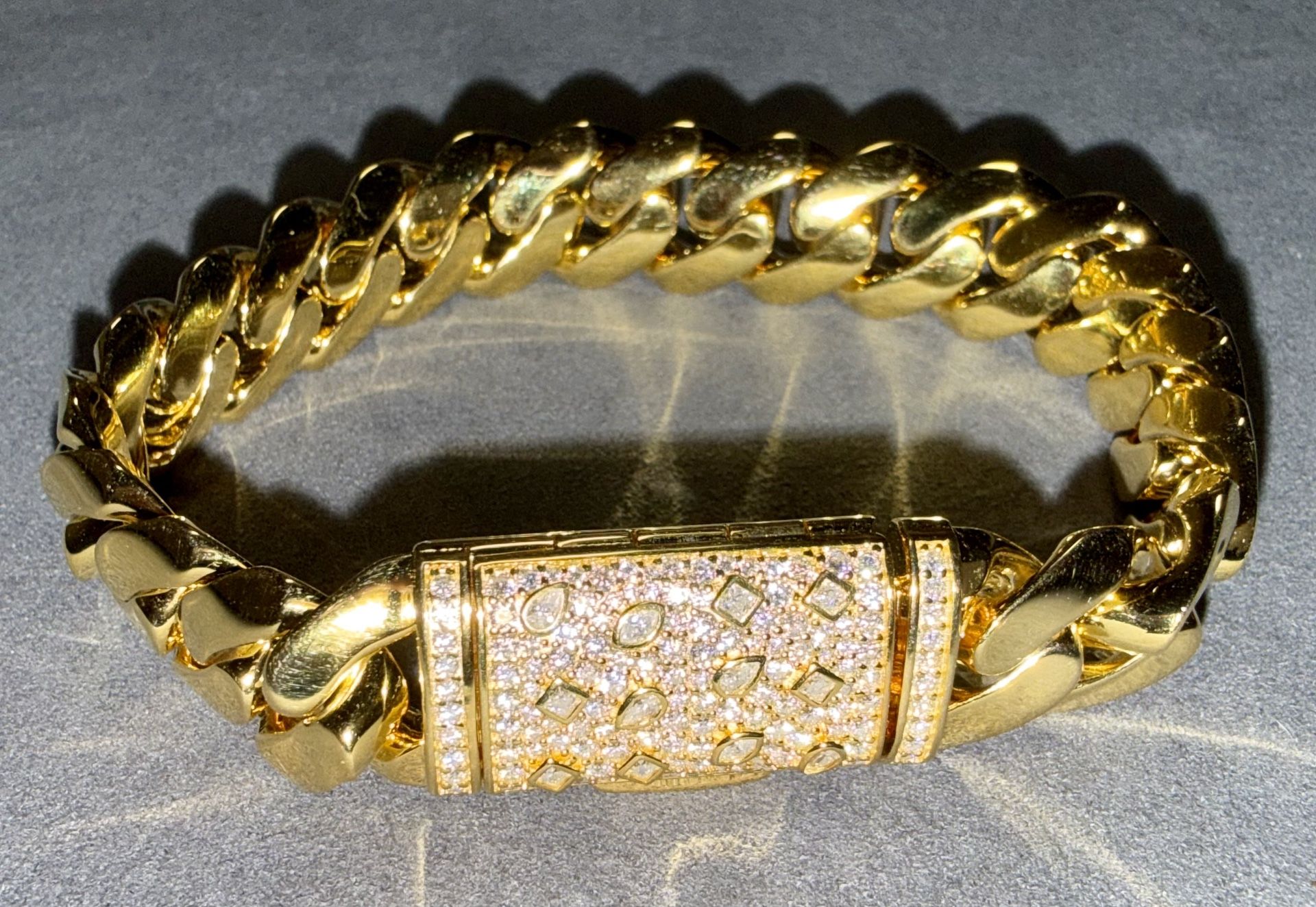 This 14mm Miami Cuban Link Bracelet is made of 14k gold plated sterling silver, featuring a yellow color and a high-quality craftsmanship. It has a distinct mosaic moissanite stone set lock thats guaranteed to stand out. This bracelet showcases a unique Cuban link design, perfect for adding a touch of luxury and style to any outfit. This stunning piece is sure to make a statement and elevate any casual or formal look with its exquisite craftsmanship. Sizes:8-9