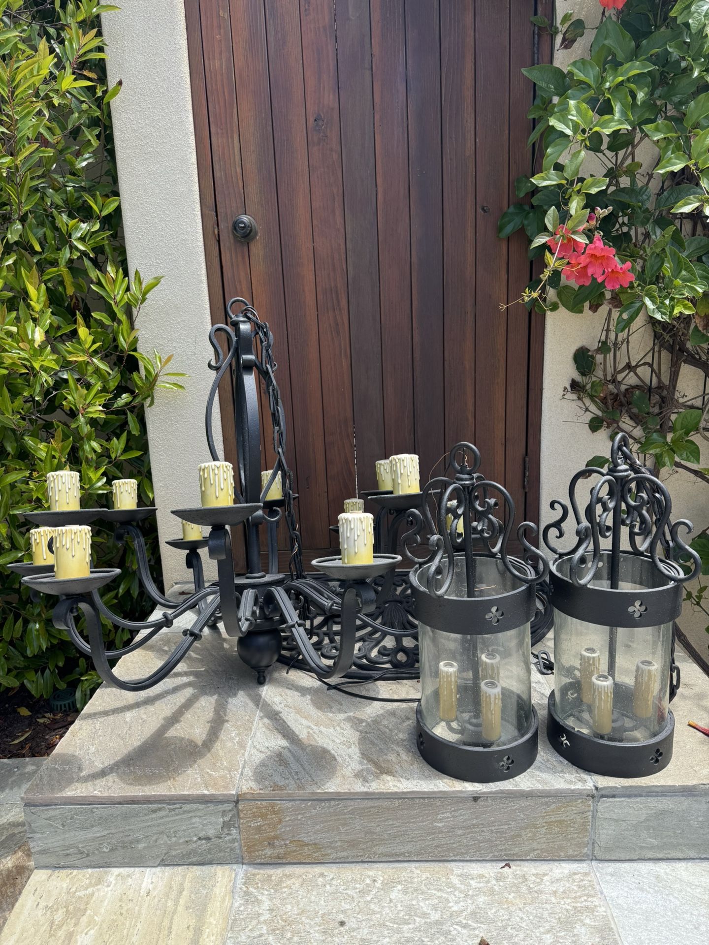 Classic, high quality chandelier and matching pendants. Wrought iron, old world charm with candle wax light bulb holders. Exceptional price for these high end light fixtures. Individual Pieces Sold Too Message For Details