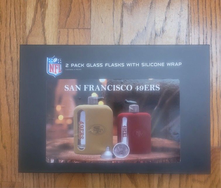 Licensed NFL The set includes two glass flasks, one red and one gold/tan, featuring "49ERS" text and the team logo. The flasks have removable silicone sleeves for a better grip. They are designed with an easy-pour window to monitor liquid levels. The set comes in a presentation box, making it suitable as a gift. Flasks are ideal for carrying spirits like whiskey or vodka discreetly.