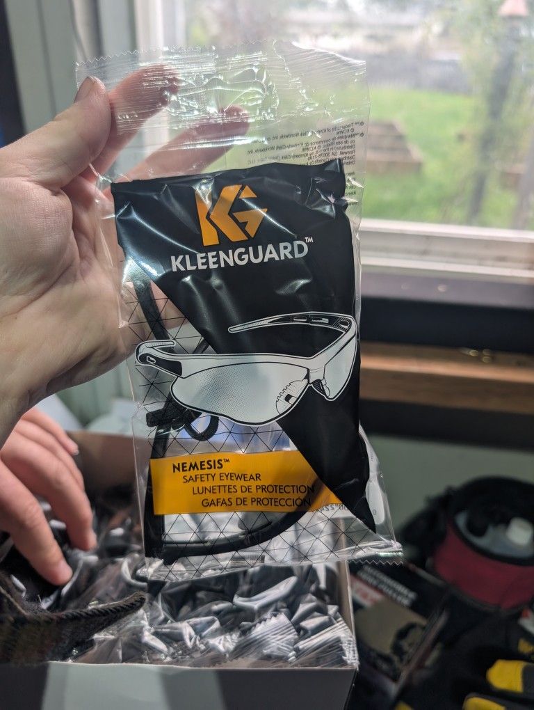 We have 11 boxes of new still in wrapping safety glasses there are 12 glasses per box. 50$ per box or 90$ for both.