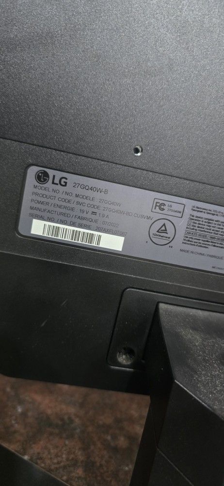 LG 27GQ50F-B Gaming Monitor Brand: LG Model: 27GQ50F-B Product / SVC Code: 27GQ50F-BD.CUSVMV Screen Size: 27" Power Input: 19V ⎓ 1.9A Manufacture Date: August 2022 Serial Number: 208AXCU1A9O7 Condition: Used (works perfectly) LG 27GQ40W-B Gaming Monitor Brand: LG Model: 27GQ40W-B Product Code / SVC Code: 27GQ40W-BD.CUSVMV Screen Size: 27" Power Input: 19V ⎓ 1.9A Manufacture Date: July 2022 Serial Number: 207AXFLOTO67 Condition: Used (works perfectly)