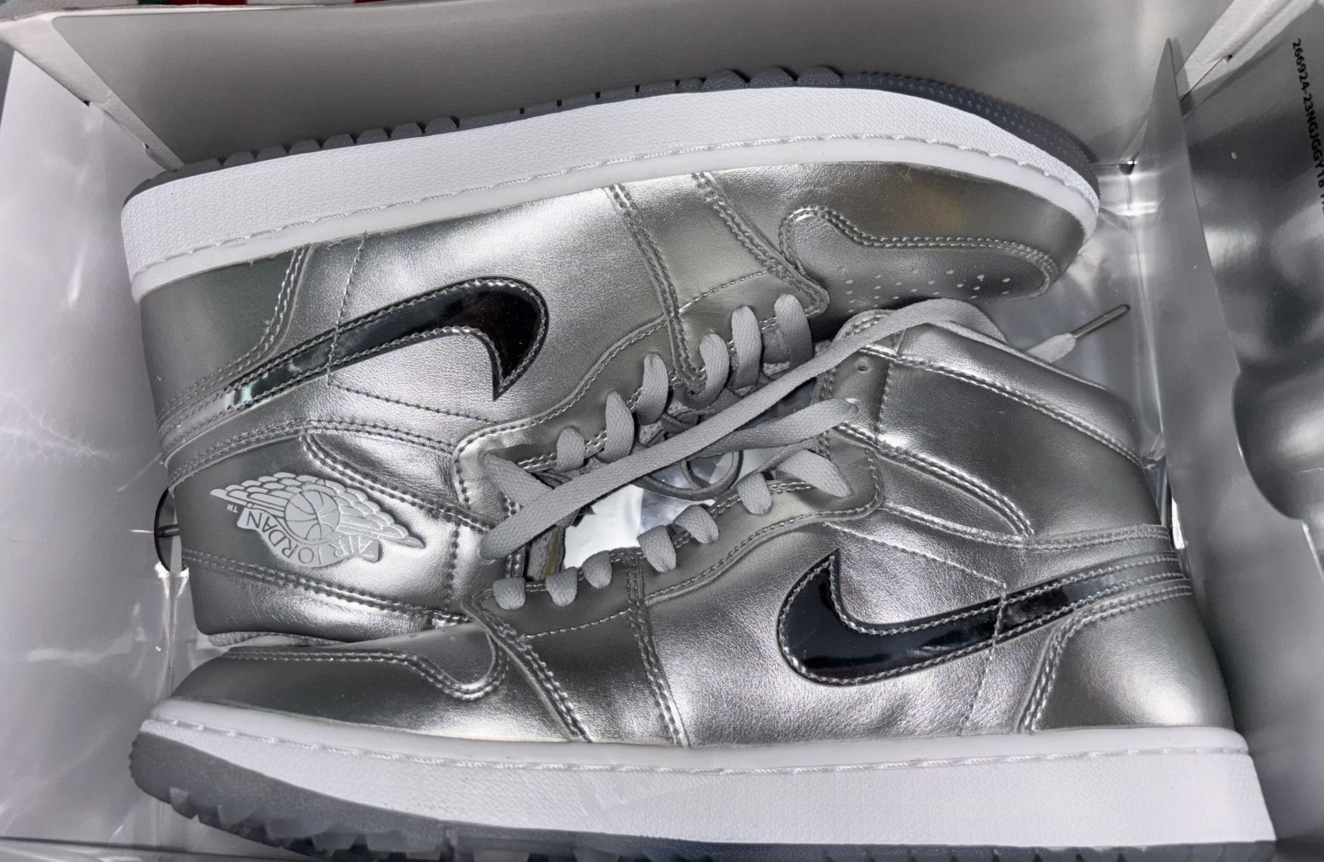 Purchased November 19, 2023 from the Nike website. Includes original box and packaging. Elevate every round with the Jordan 1 High Golf Gift Giving Pack, a heritage icon reimagined for the course. Dressed in Metallic Silver, Photon Dust, and crisp White, this high-cut silhouette brings standout shine to the fairway while preserving the timeless lines of the original Jordan 1.