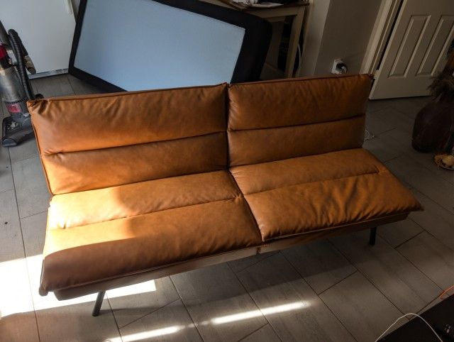 Tan/beige color Had it for less than a year. Paid 150 for it originally. There is absolutely no damage to it, had a cover over it because I have a small dog. There maybe some dog hair in the back part of the futon, cuz the damn dog thought it was a bed for him. I vacuumed it a bit otherwise. It's pretty much new though. 3 positions: sitting, leaning back, flat Downtown phoenix area. Cash only