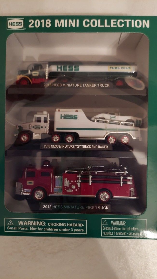 Hess 2018 mini collection includes... set of (3)three trucks... miniature tanker truck, miniature toy truck and racer car, miniature fire truck. New in original packaging, unopened, never used.