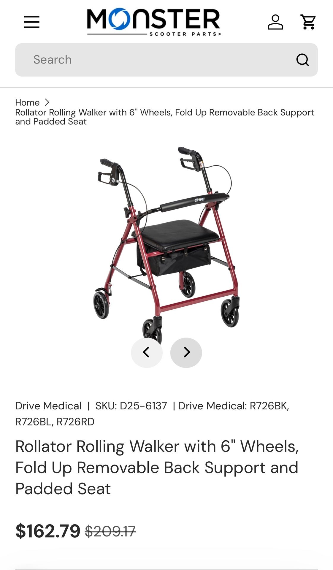 KEY FEATURES: • Strong, Durable Steel Frame | Weight Capacity: 350 lbs. • Sturdy and Light Weight |17 lbs. • Height Adjustable Handles: 31"-37" | For a Customized Fit • Padded Seat: 12" Deep | Comfortable Seating • Padded, Removable, Flip-up Backrest | Comfort and Support • Under-Seat Storage Pouch: 12"W x 7"L x 5"D | Easily Stores Personal Items • Ergonomic Hand Grips • Loop-Style Locking Hand Brakes | Safety and Control • Soft Grip 6" Wheels | Perfect for Indoor and Outdoor Use • Compact and Foldable: 6.5" Depth | Easy to Store and Transport • Some Tool-free Assembly Required | Quick and Easy Assembly • Limited Lifetime Warranty • HCPCS REIMBURSEMENT CODE: E0143 + E0156 • Dimensions: 22.25"W x 24.8"L x 31.5"H • Width Between Handles: 18" • Seat to Floor Height: 20"