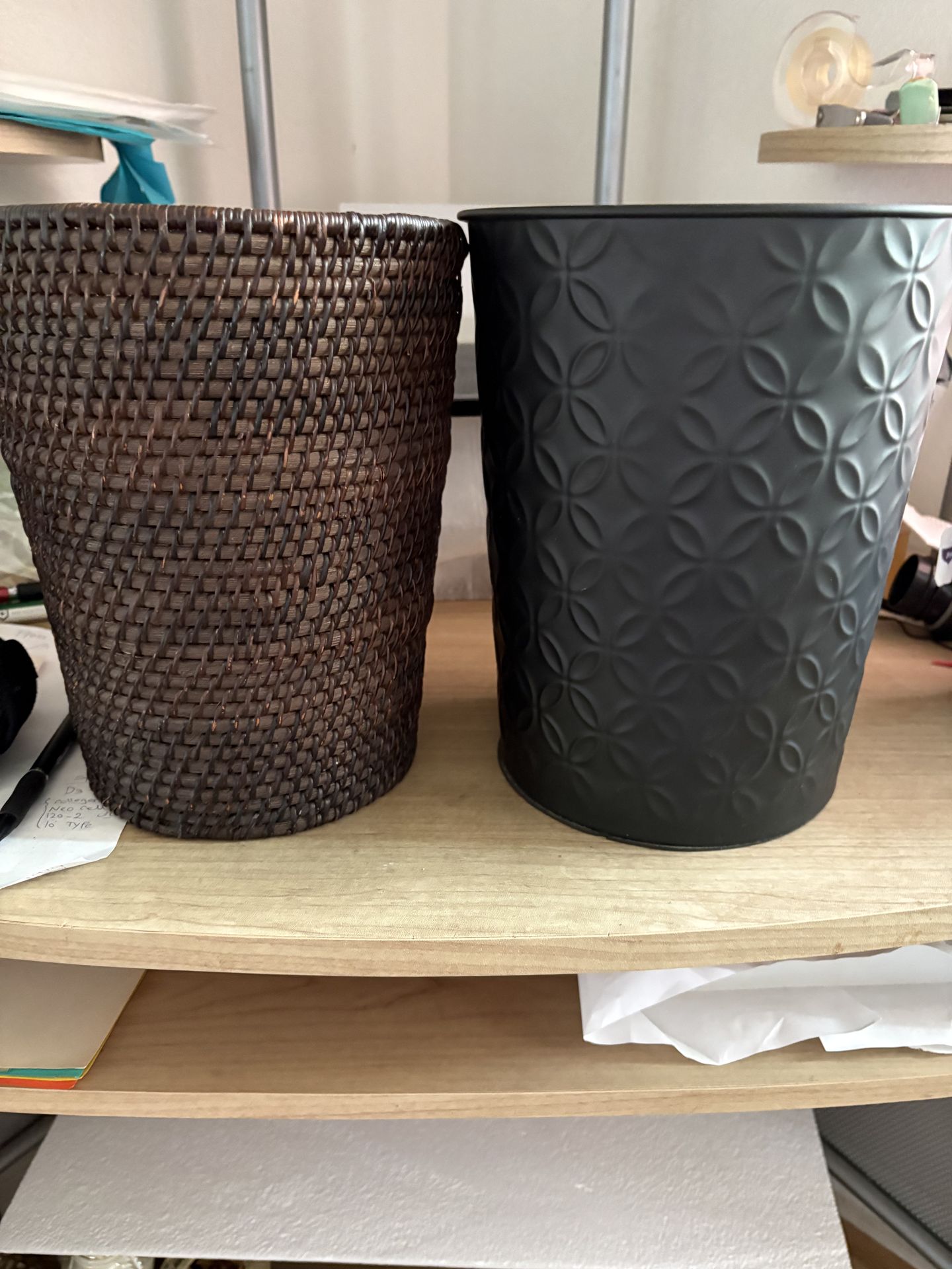 One brown wicker trash can. One black metal trash can Same size, Each $10. Both for $17. Cash & pickup